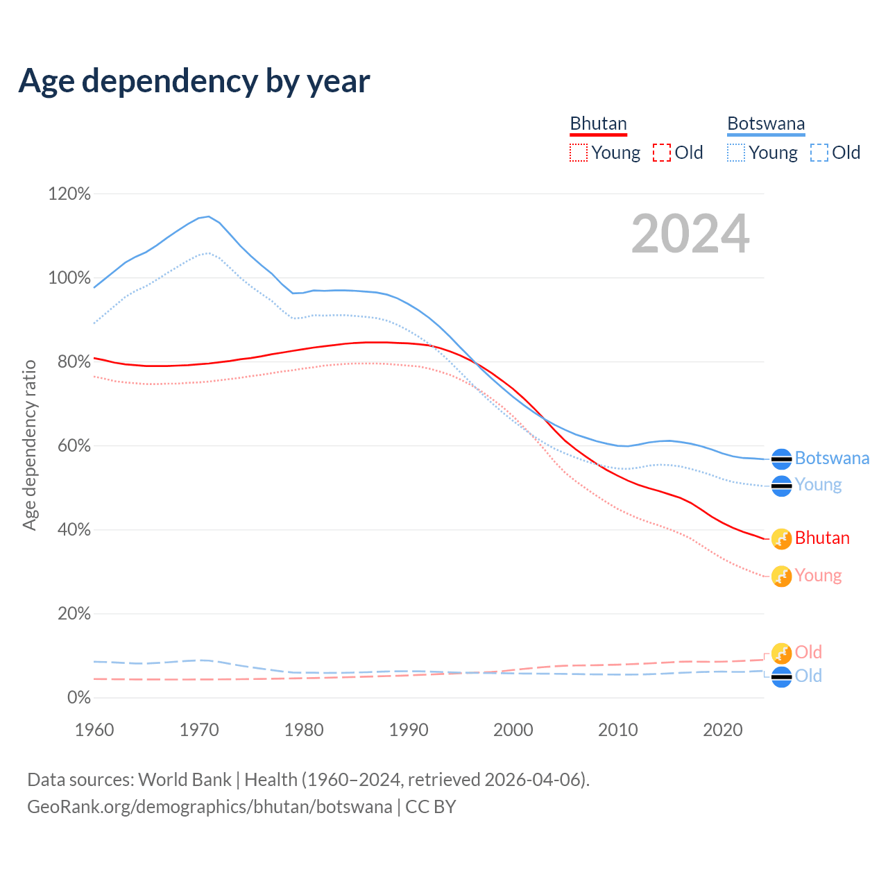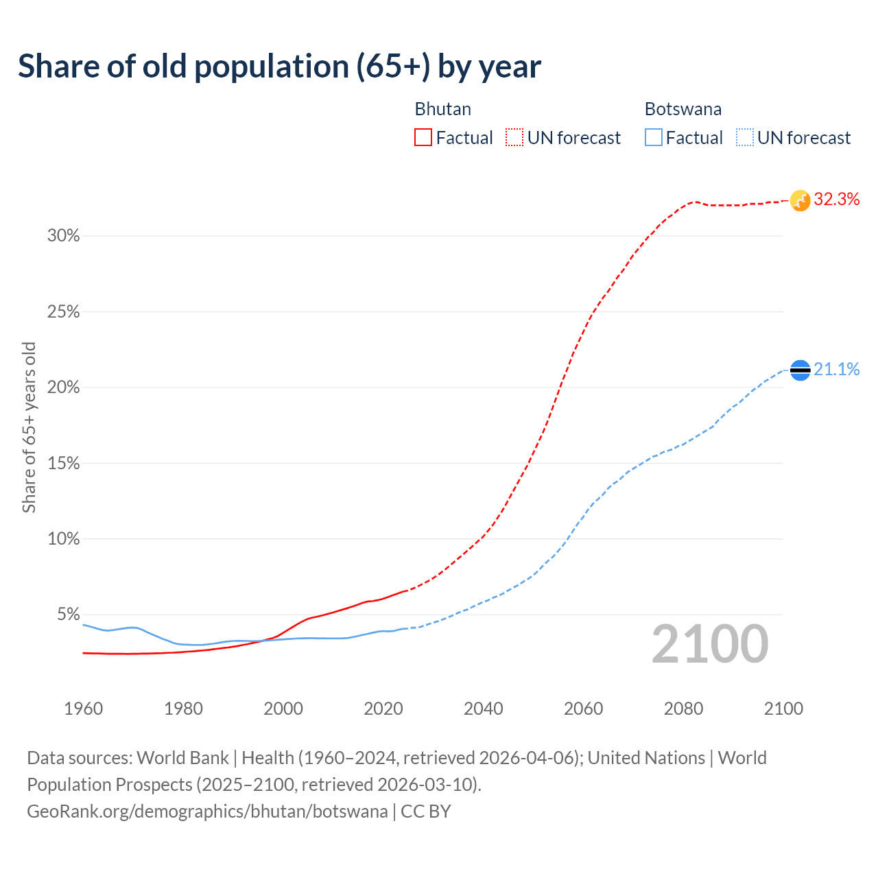 - The share of old-age demographic (65+) in Bhutan is 6.49% vs 4.04% in Botswana.