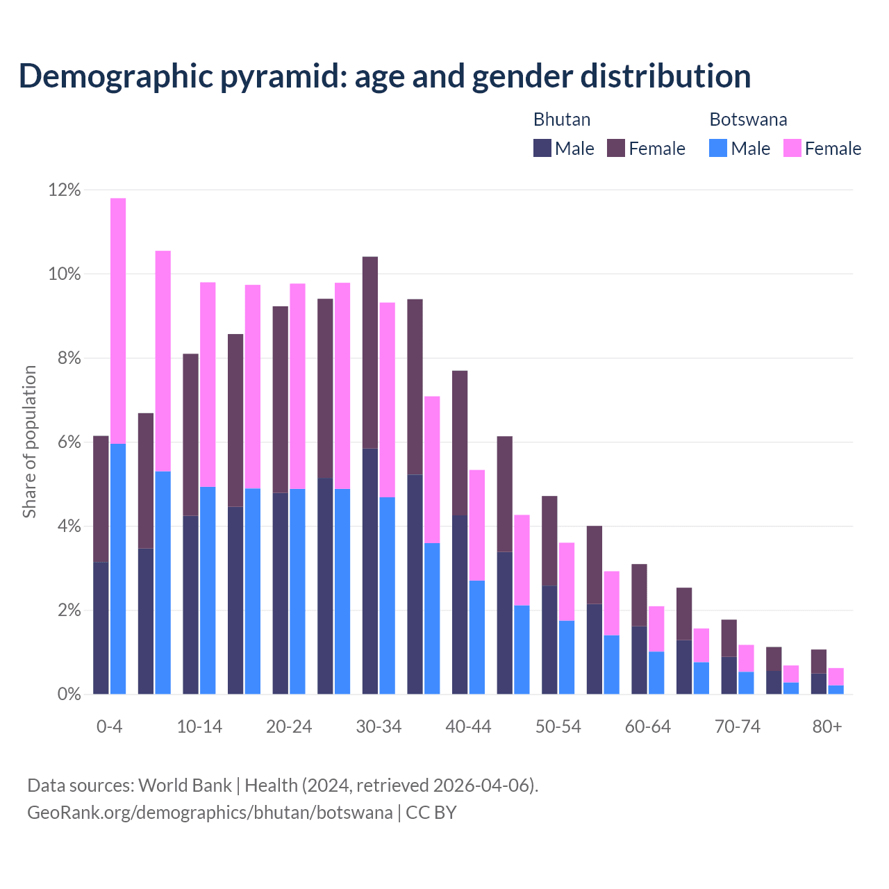 - Bhutan is ranked 95/196 by median age (oldest to youngest) vs 136/196 for Botswana.