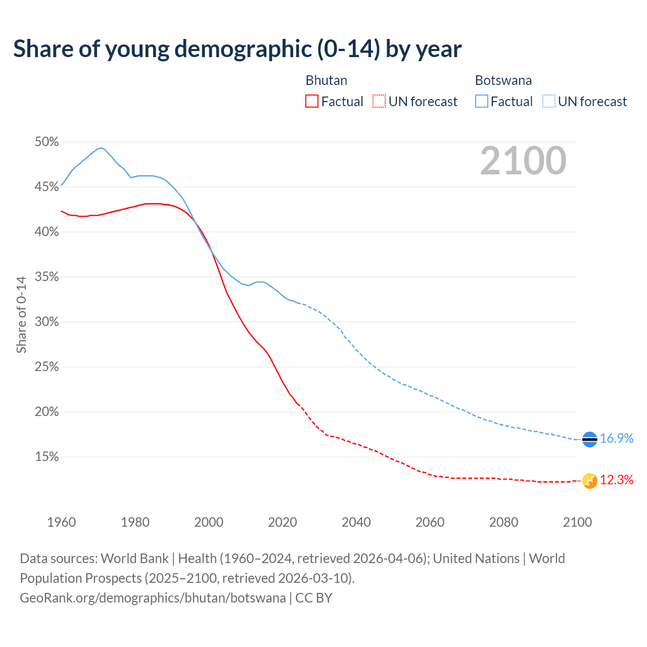 - The share of young demographic (0-15 years old) in Bhutan is 20.9% vs 32.1% in Botswana.