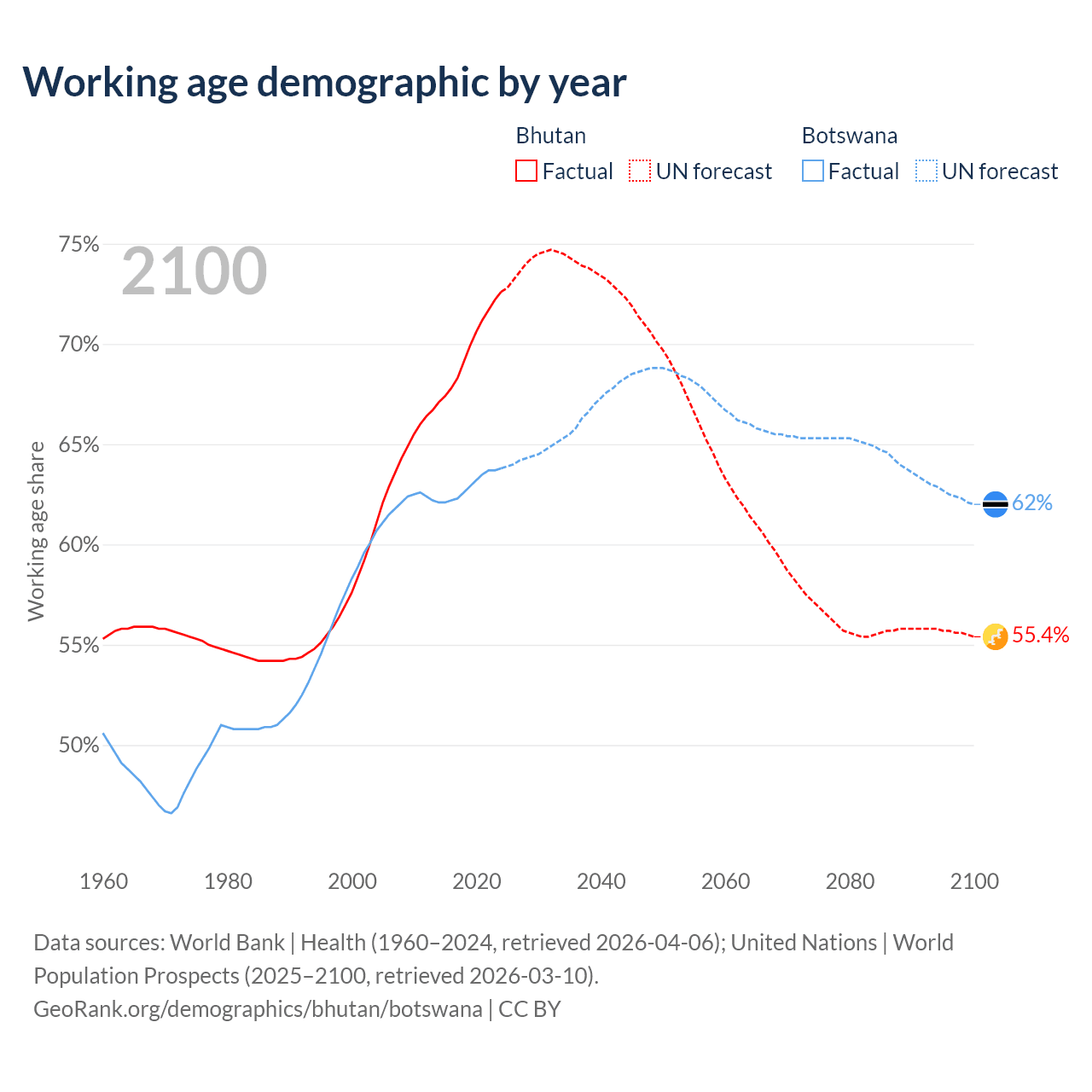- Bhutan has 583K working age adults (aged 15-64) vs 1.67M in Botswana.
