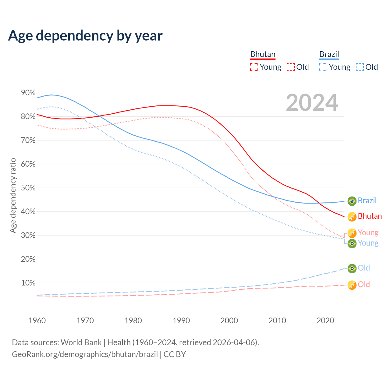 - Bhutan is ranked 95/196 by median age (oldest to youngest) vs 73/196 for Brazil.