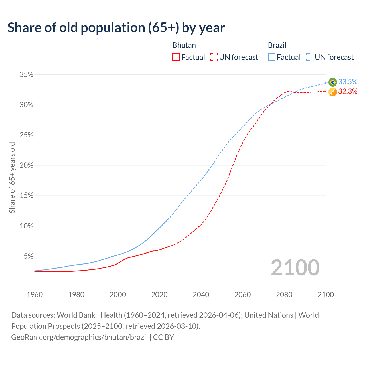 The share of older people aged 65 and over is 6.49% in Bhutan and 11% in Brazil. Life expectancy in Bhutan compared to Brazil .