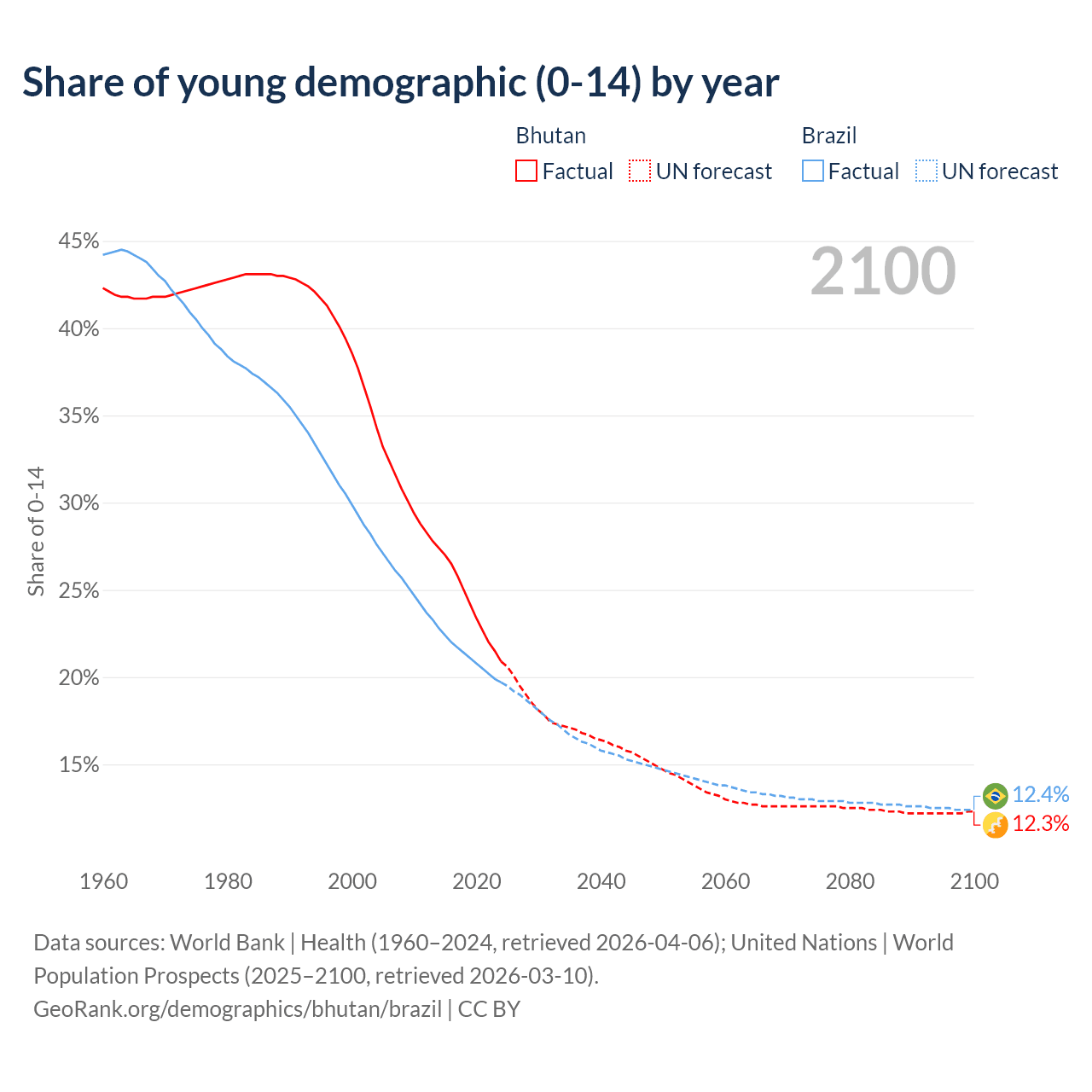 - The share of young demographic (0-15 years old) in Bhutan is 20.9% vs 19.7% in Brazil.