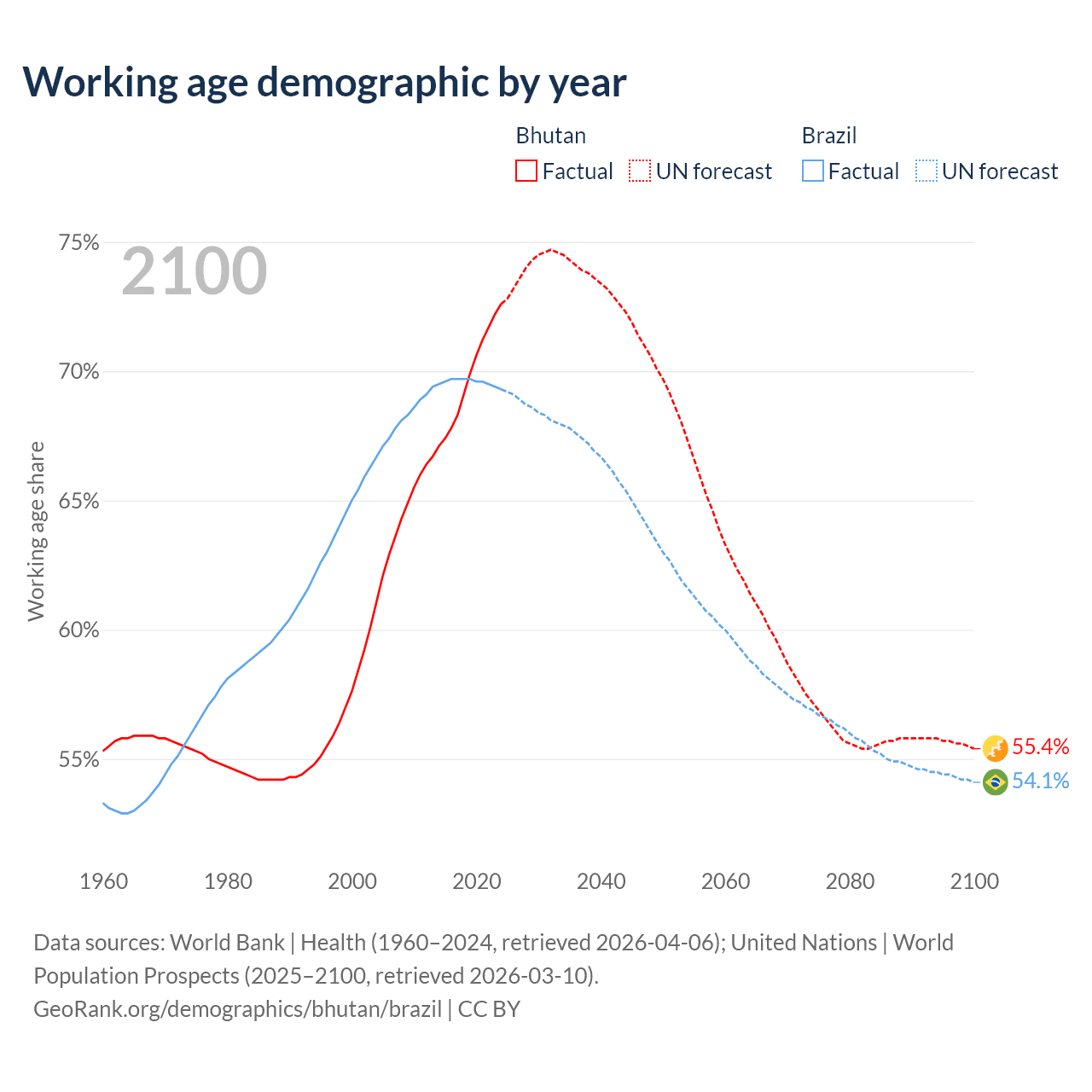 - Bhutan has 583K working age adults (aged 15-64) vs 148M in Brazil.