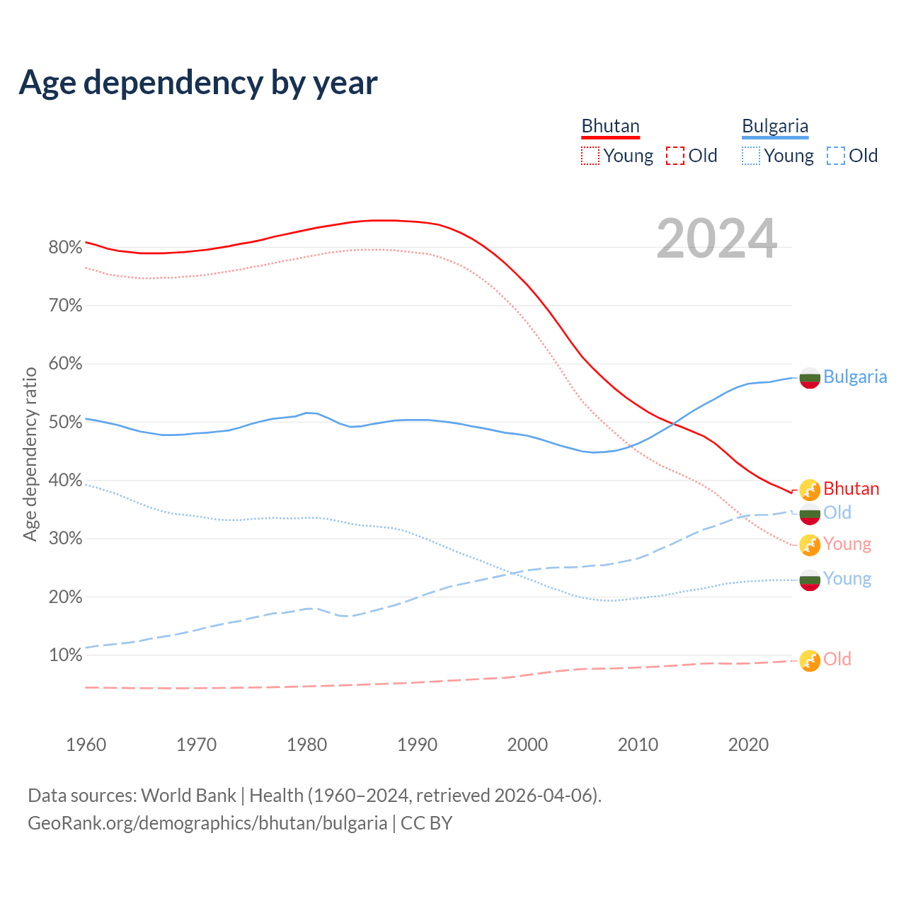 - The share of old-age demographic (65+) in Bhutan is 6.49% vs 22% in Bulgaria.