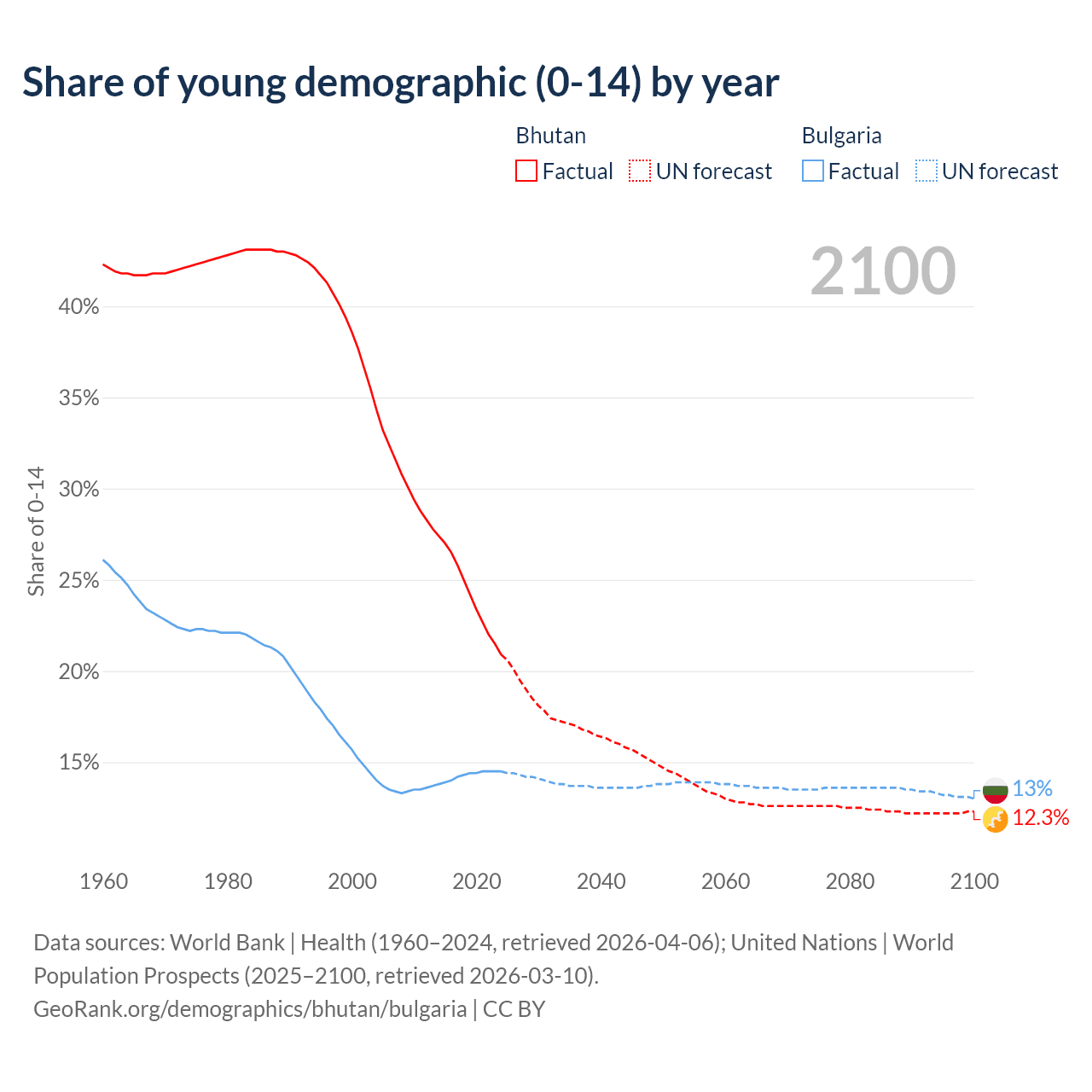 - The share of young demographic (0-15 years old) in Bhutan is 20.9% vs 14.5% in Bulgaria.
