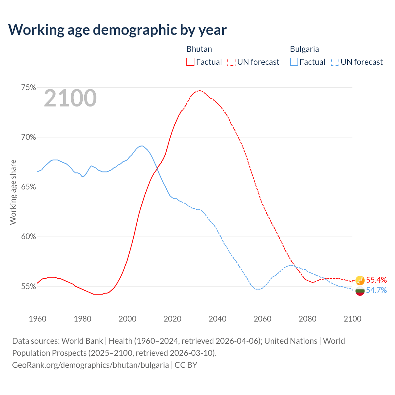 - Bhutan has 583K working age adults (aged 15-64) vs 4.04M in Bulgaria.