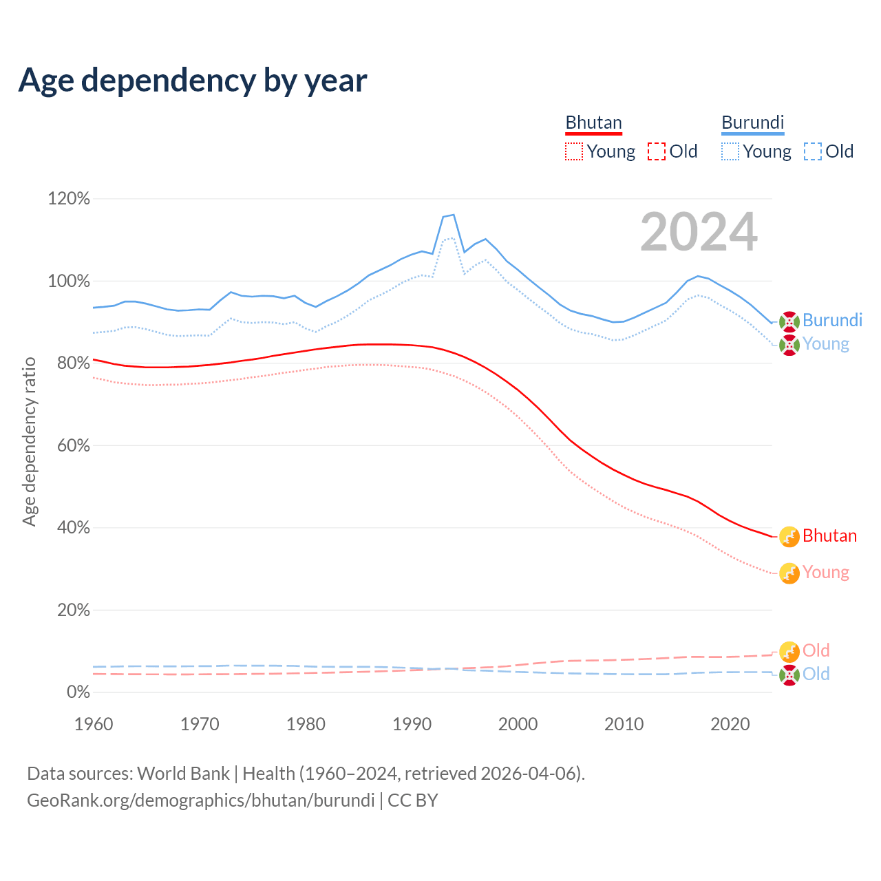 - The share of old-age demographic (65+) in Bhutan is 6.49% vs 2.53% in Burundi.