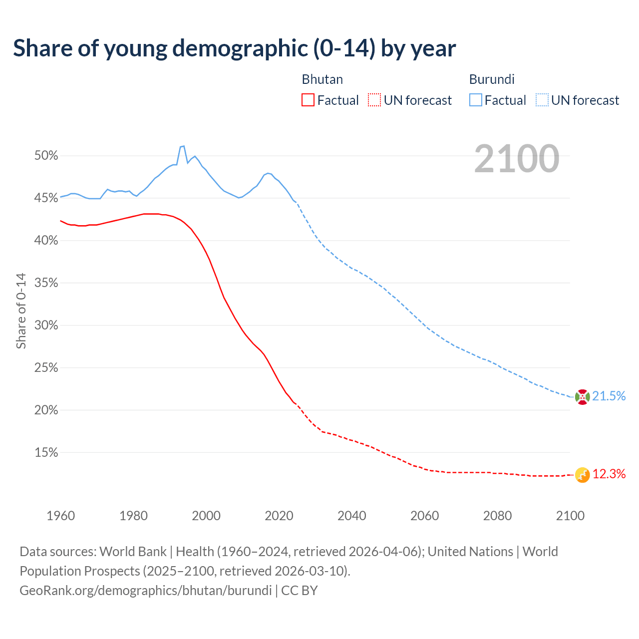 - The share of young demographic (0-15 years old) in Bhutan is 20.9% vs 44.7% in Burundi.