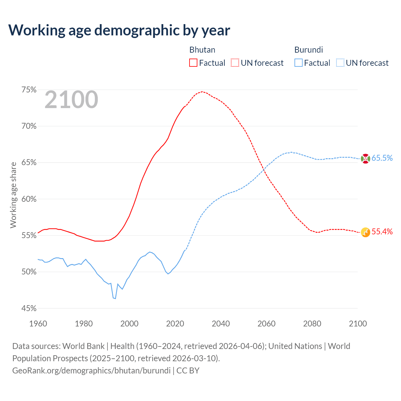 - Bhutan is ranked 95/196 by median age (oldest to youngest) vs 190/196 for Burundi.