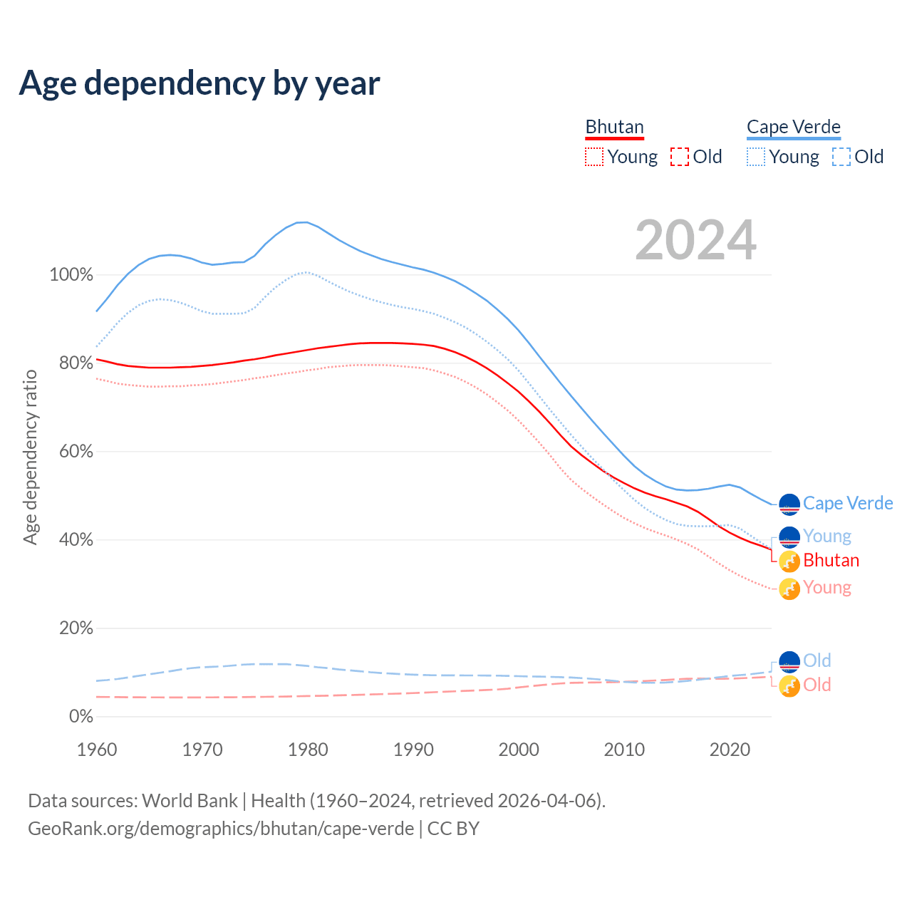 - The share of young demographic (0-15 years old) in Bhutan is 20.9% vs 25.5% in Cape Verde.