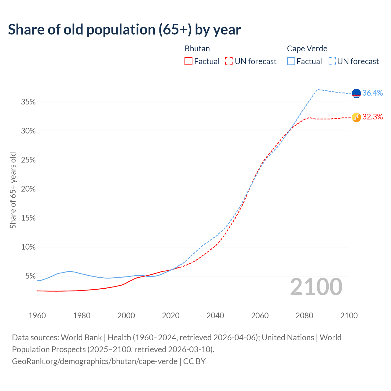 - The share of old-age demographic (65+) in Bhutan is 6.49% vs 6.86% in Cape Verde.