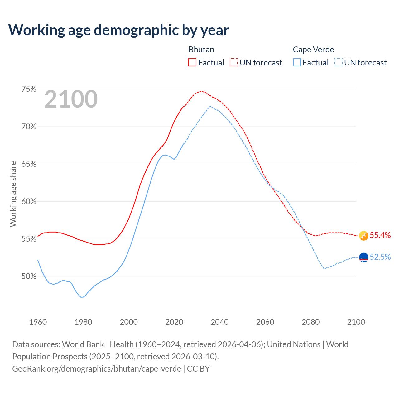 Median age Bhutan vs Cape Verde, 1960-2100