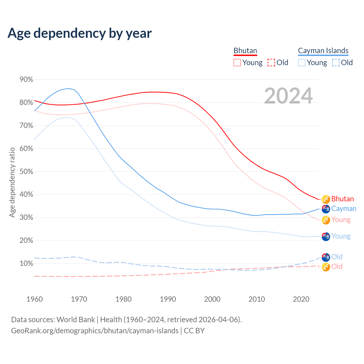 - Bhutan is ranked 95/196 by median age (oldest to youngest) vs 51/196 for the Cayman Islands.