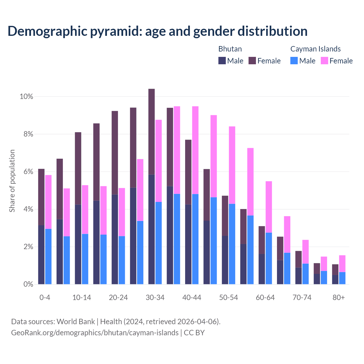 - As of 2026, the population of Bhutan is 803K vs 77.6K in the Cayman Islands - 10.4 times difference.