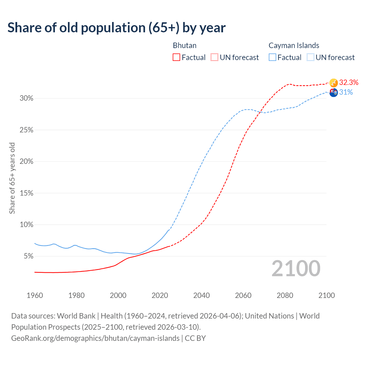 The share of older people aged 65 and over is 6.49% in Bhutan and 9% in the Cayman Islands. Life expectancy in Bhutan compared to the Cayman Islands .