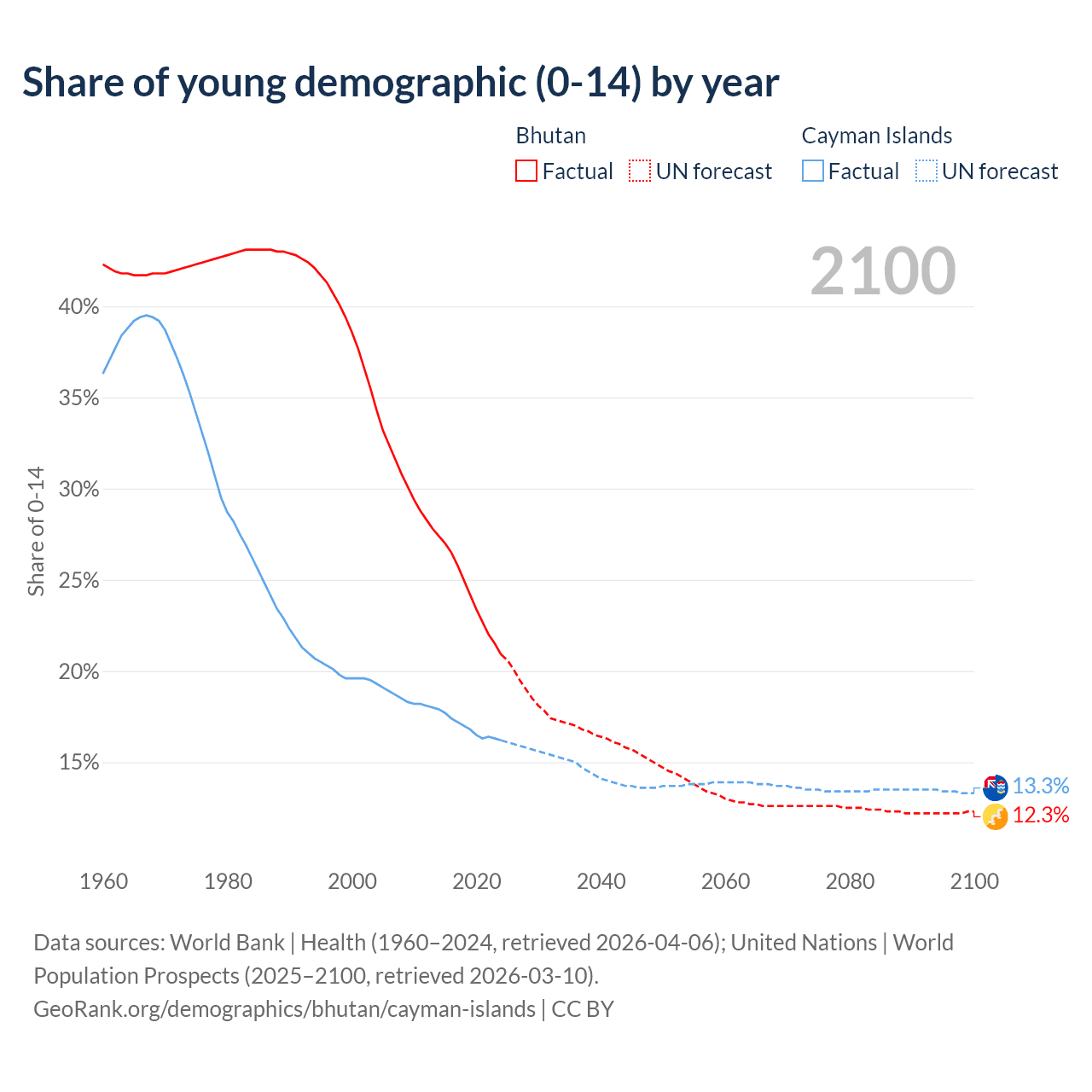- The share of young demographic (0-15 years old) in Bhutan is 20.9% vs 16.2% in the Cayman Islands.