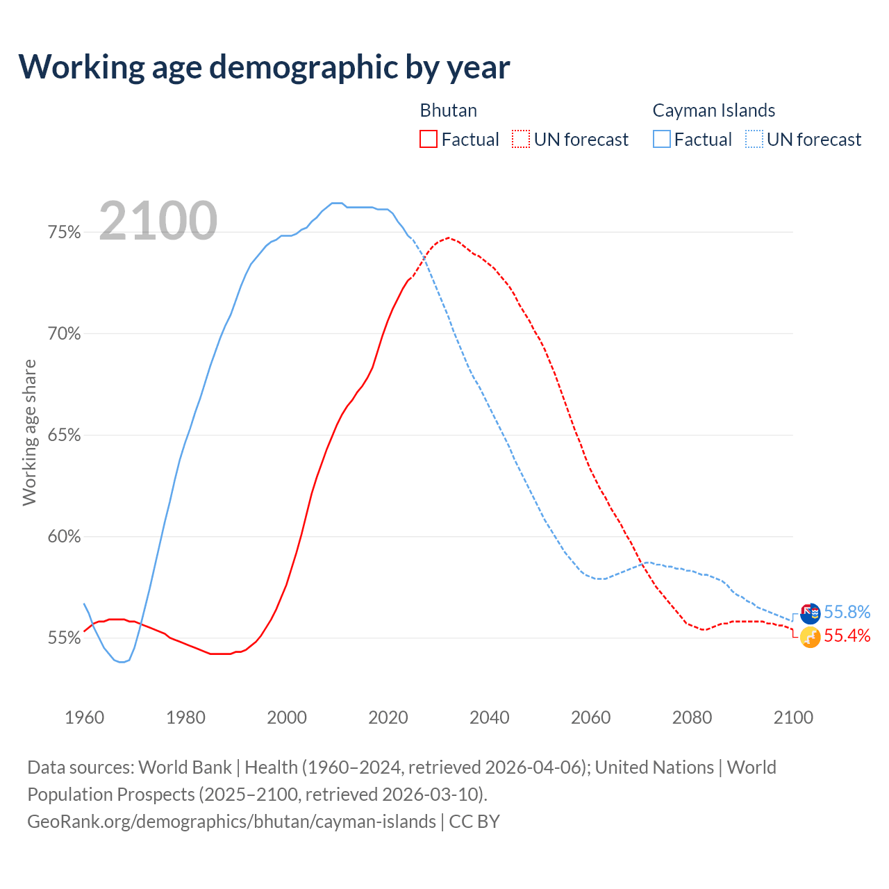 - Bhutan has 583K working age adults (aged 15-64) vs 58.1K in the Cayman Islands.