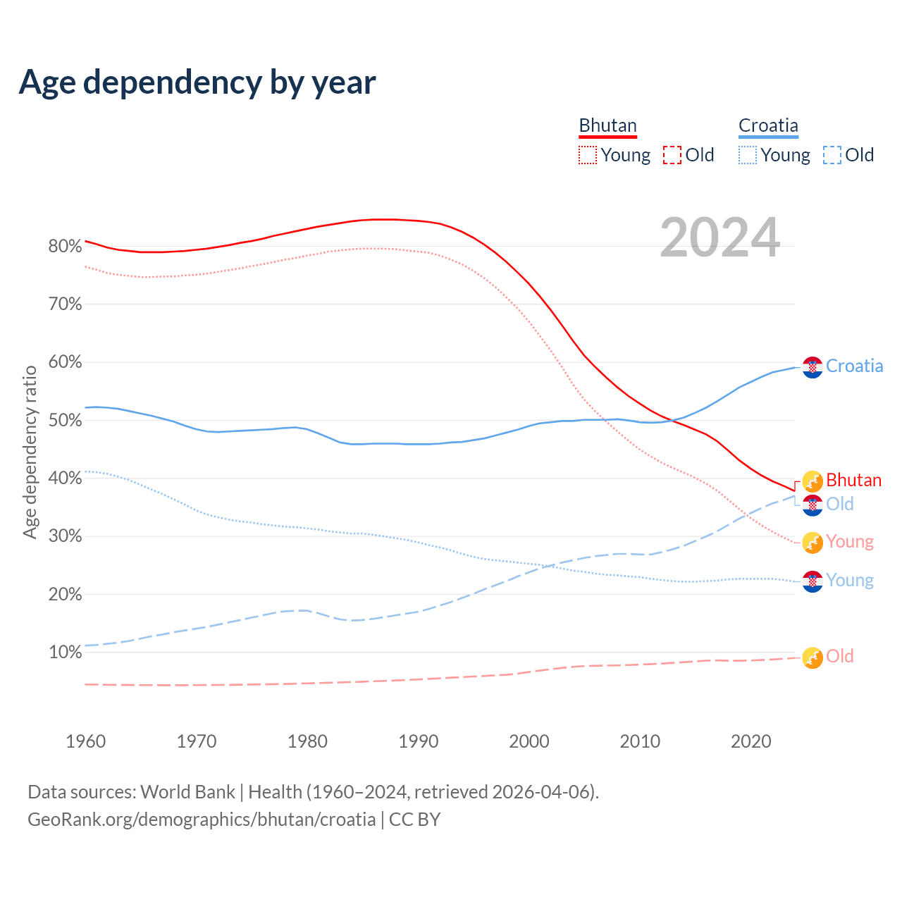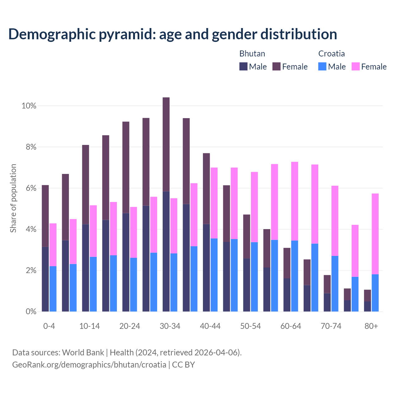 - Bhutan is ranked 95/196 by median age (oldest to youngest) vs 11/196 for Croatia.