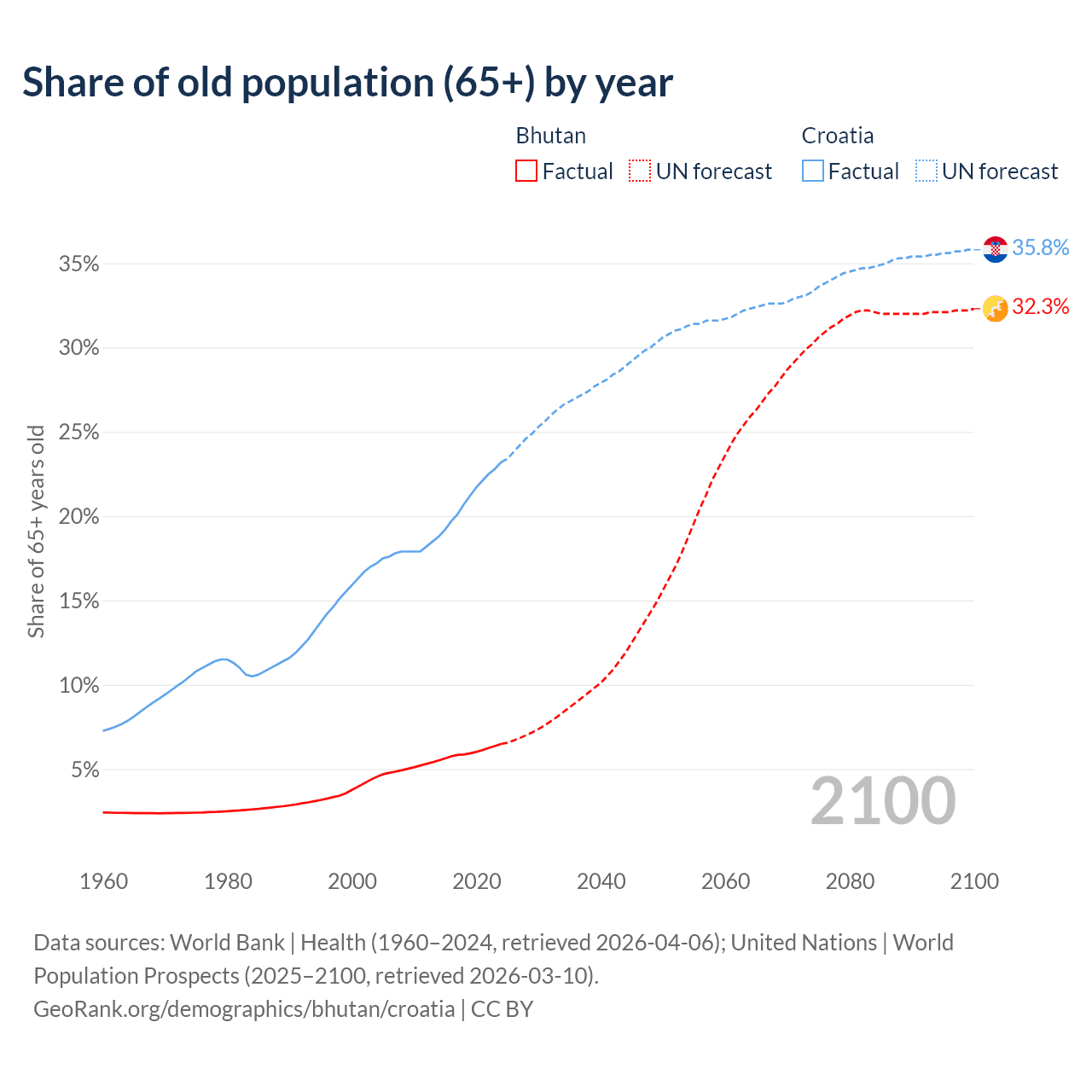 - The share of old-age demographic (65+) in Bhutan is 6.49% vs 23.2% in Croatia.
