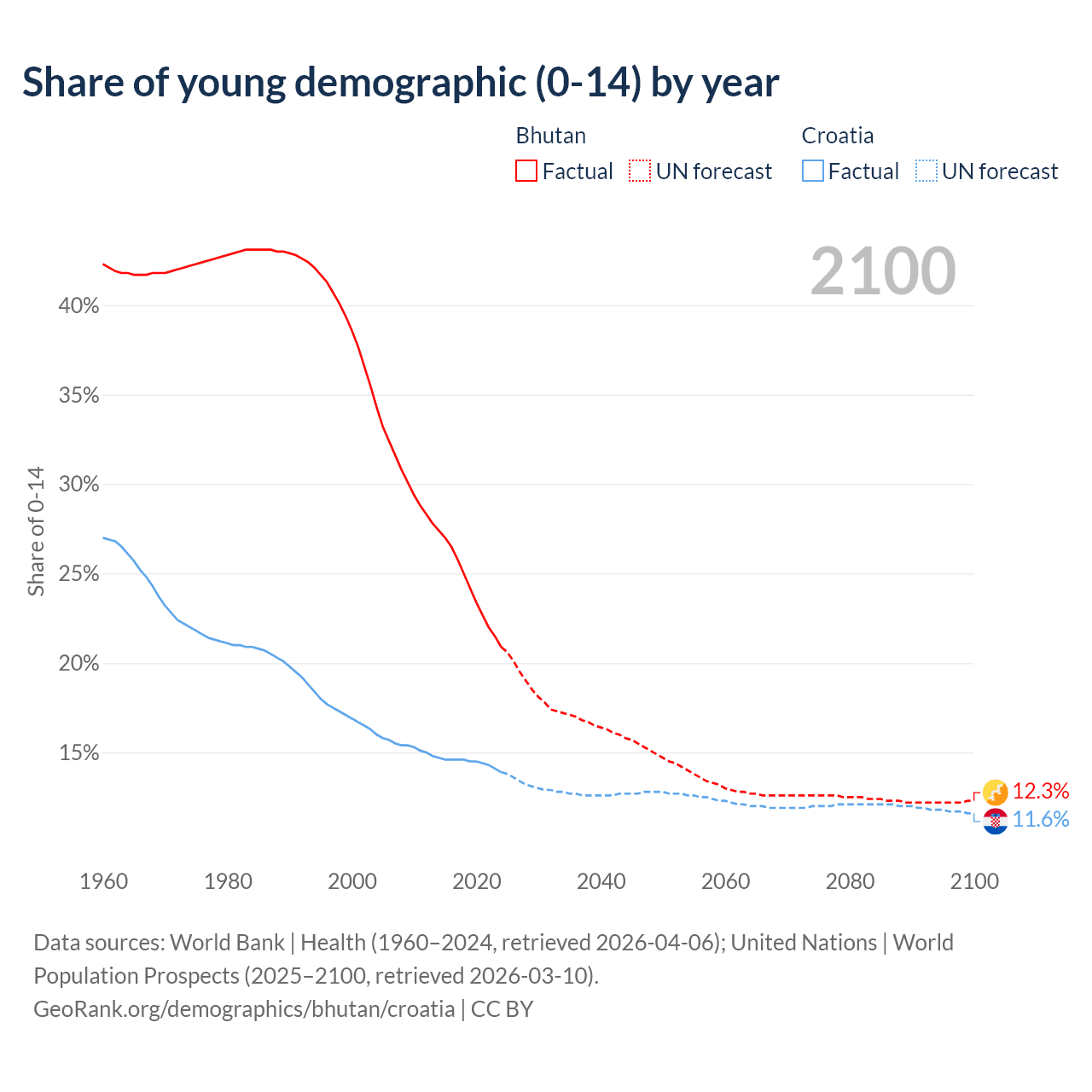 - The share of young demographic (0-15 years old) in Bhutan is 20.9% vs 13.9% in Croatia.