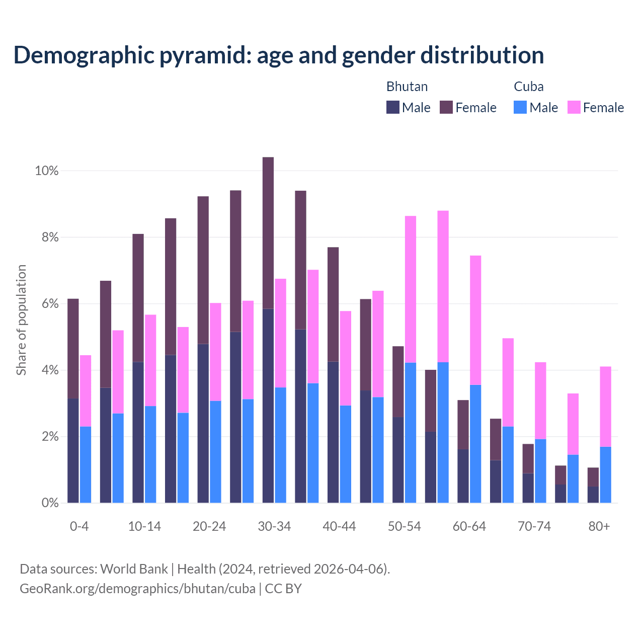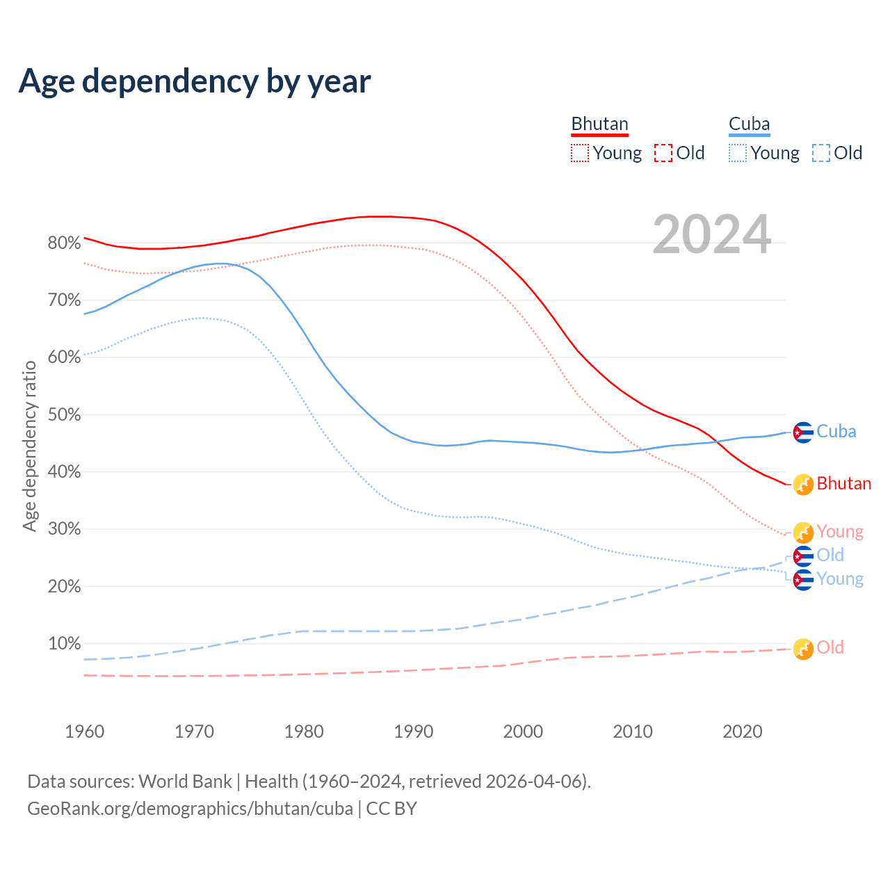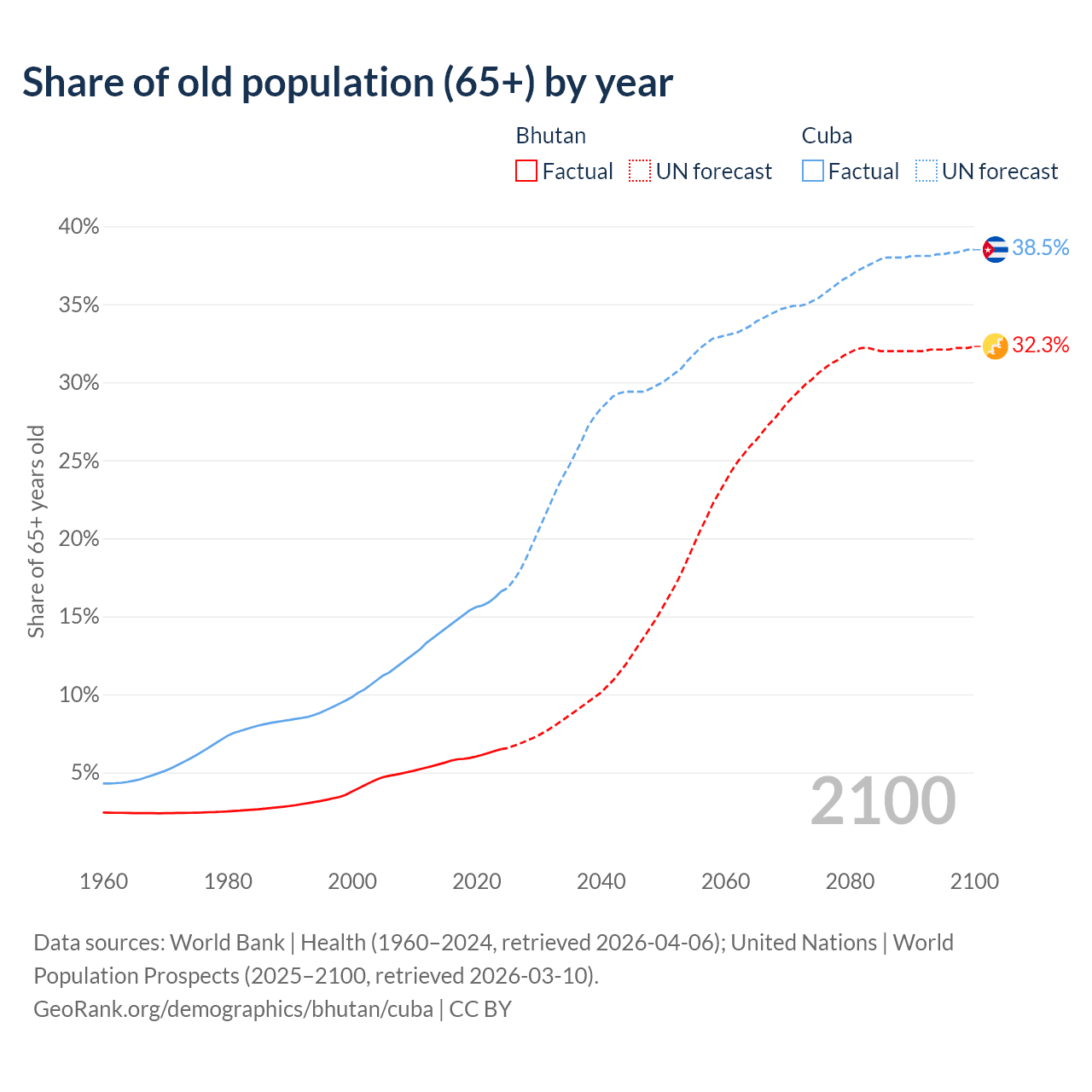 - The share of old-age demographic (65+) in Bhutan is 6.49% vs 16.6% in Cuba.