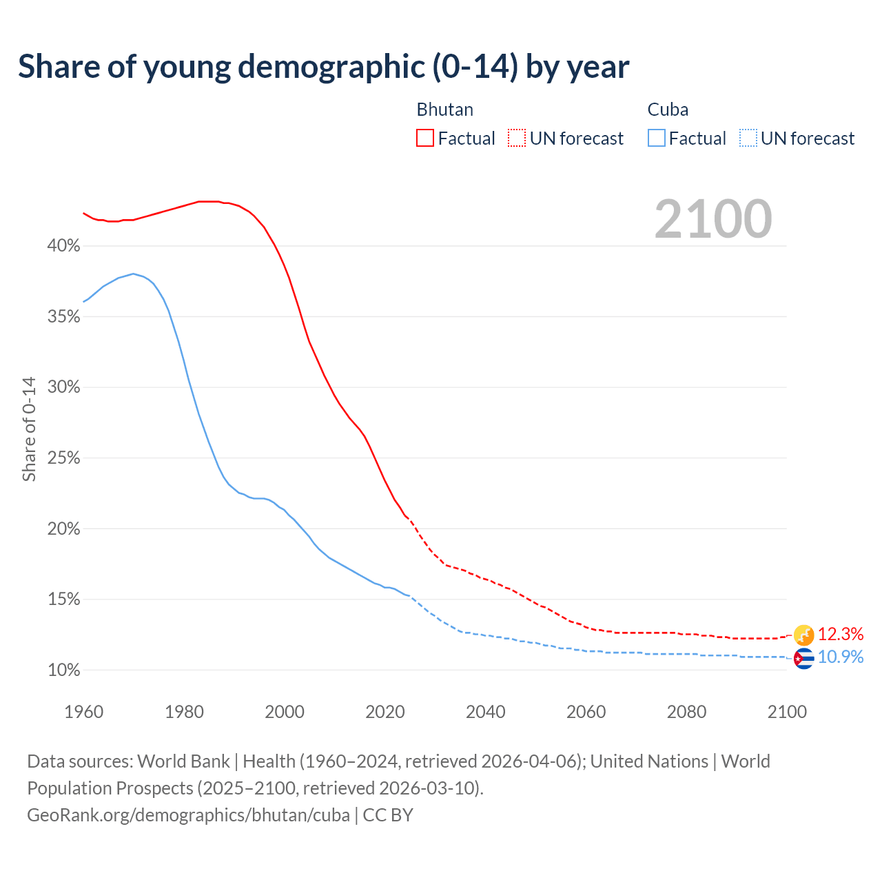 - The share of young demographic (0-15 years old) in Bhutan is 20.9% vs 15.3% in Cuba.