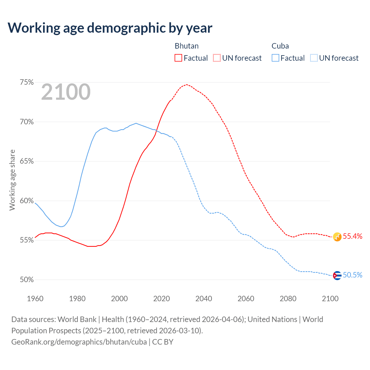 Median age Bhutan vs Cuba, 1960-2100