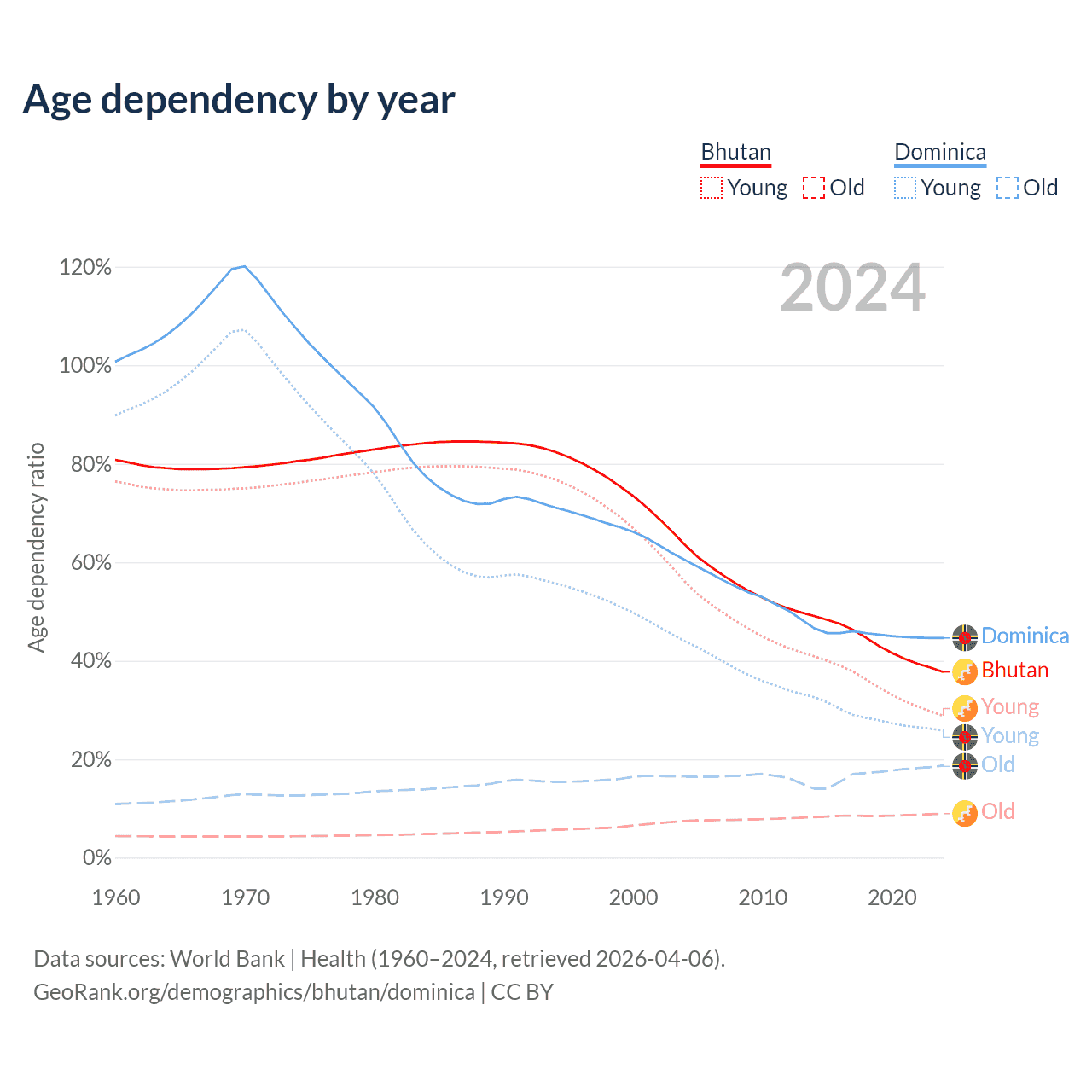 - Bhutan is ranked 95/196 by median age (oldest to youngest) vs 66/196 for Dominica.