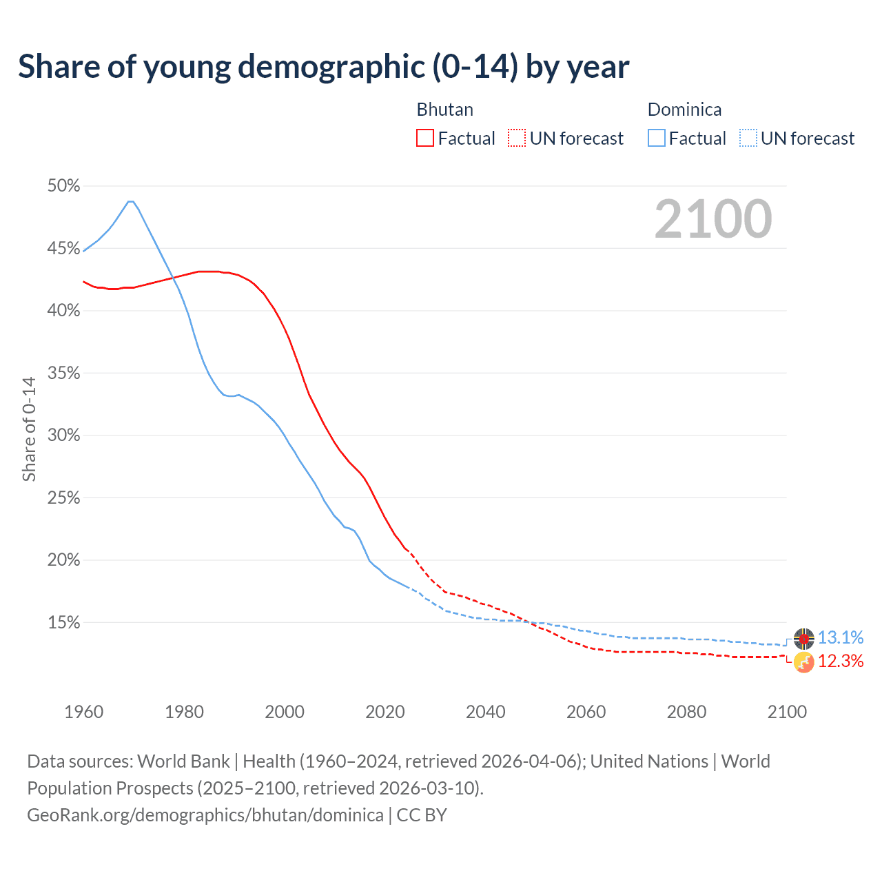 - The share of young demographic (0-15 years old) in Bhutan is 20.9% vs 17.9% in Dominica.