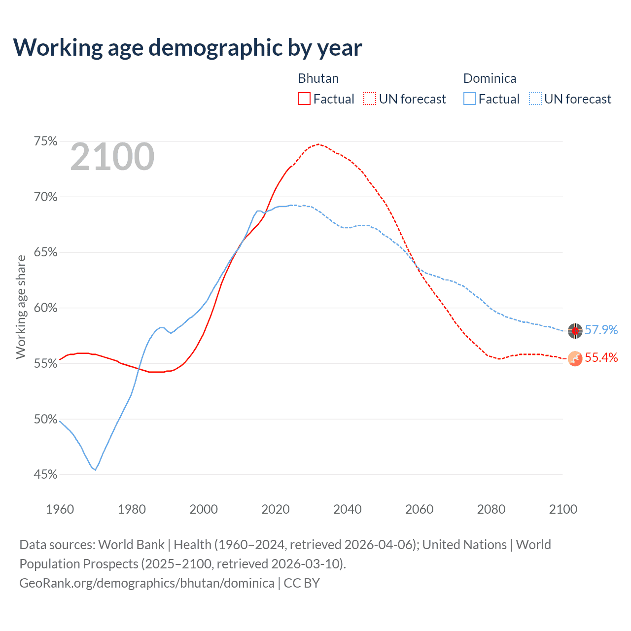 Median age Bhutan vs Dominica, 1960-2100