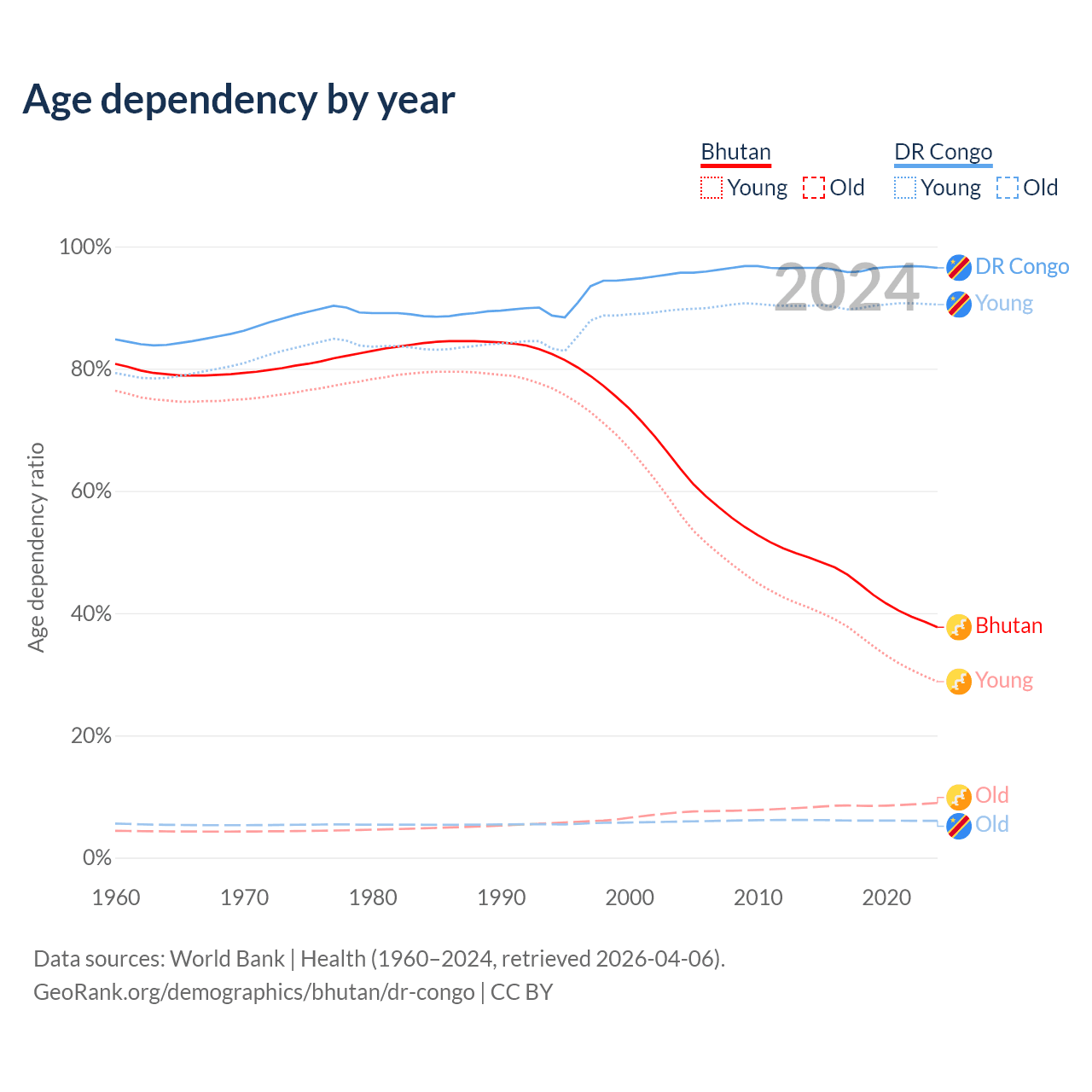 - Bhutan is ranked 95/196 by median age (oldest to youngest) vs 191/196 for the DR Congo.