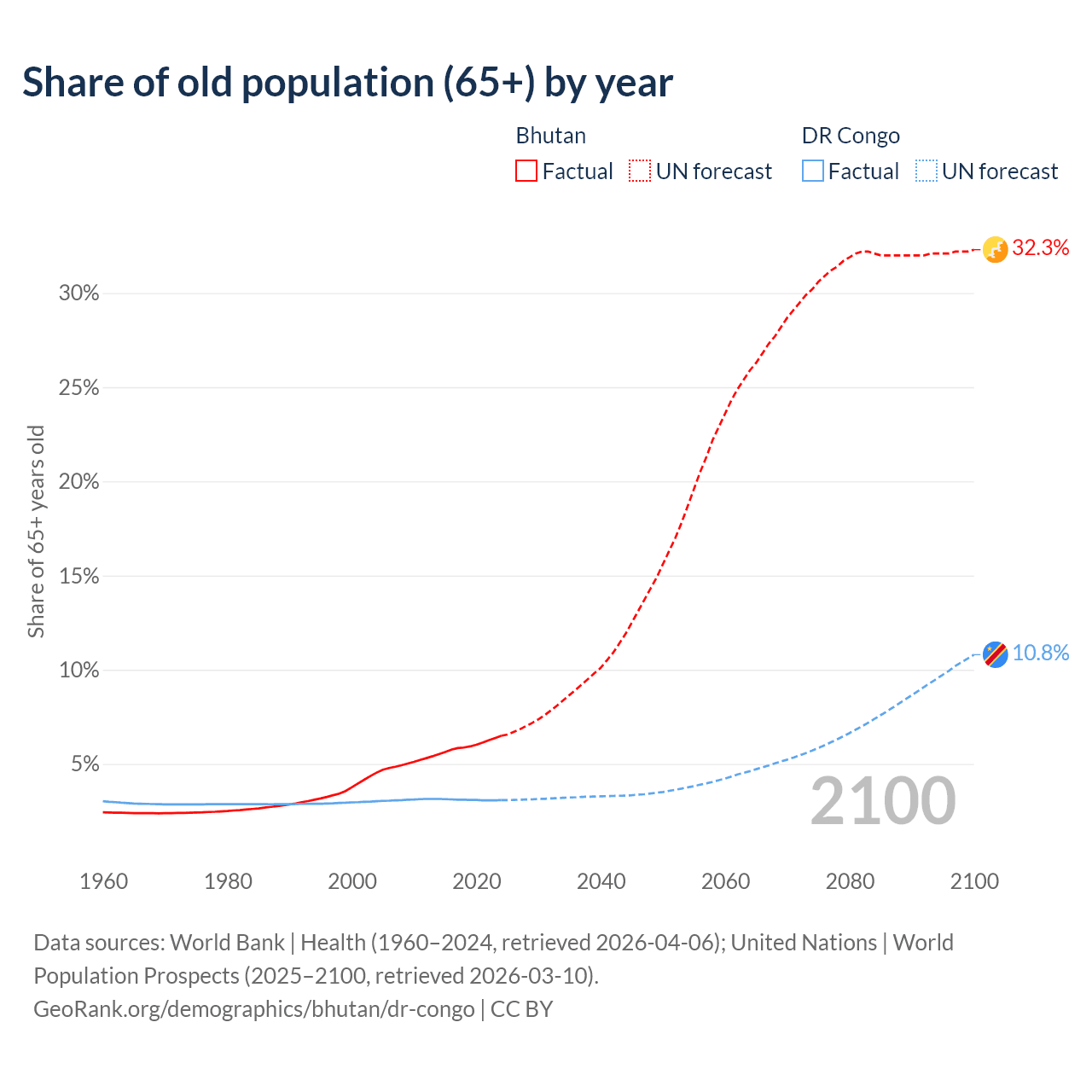 The share of older people aged 65 and over is 6.49% in Bhutan and 3.08% in the DR Congo. Life expectancy in Bhutan compared to the DR Congo .