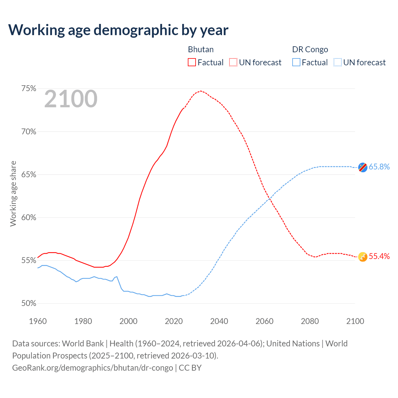 - Bhutan has 583K working age adults (aged 15-64) vs 59.8M in the DR Congo.
