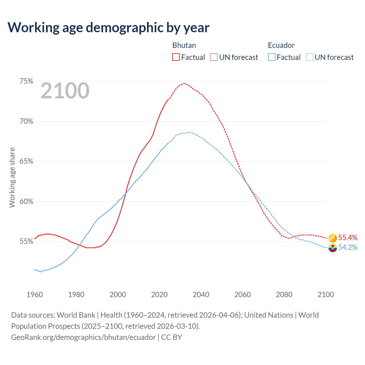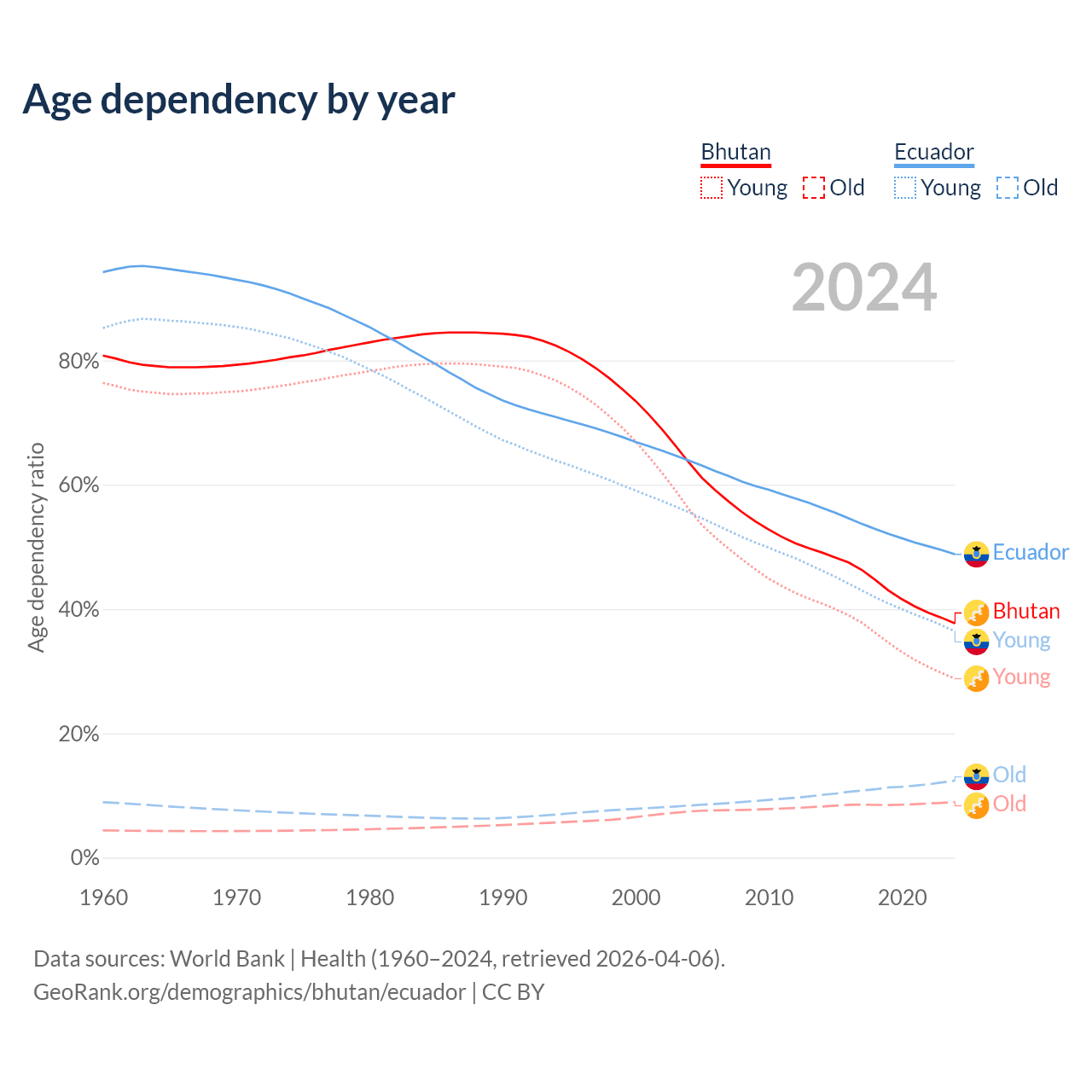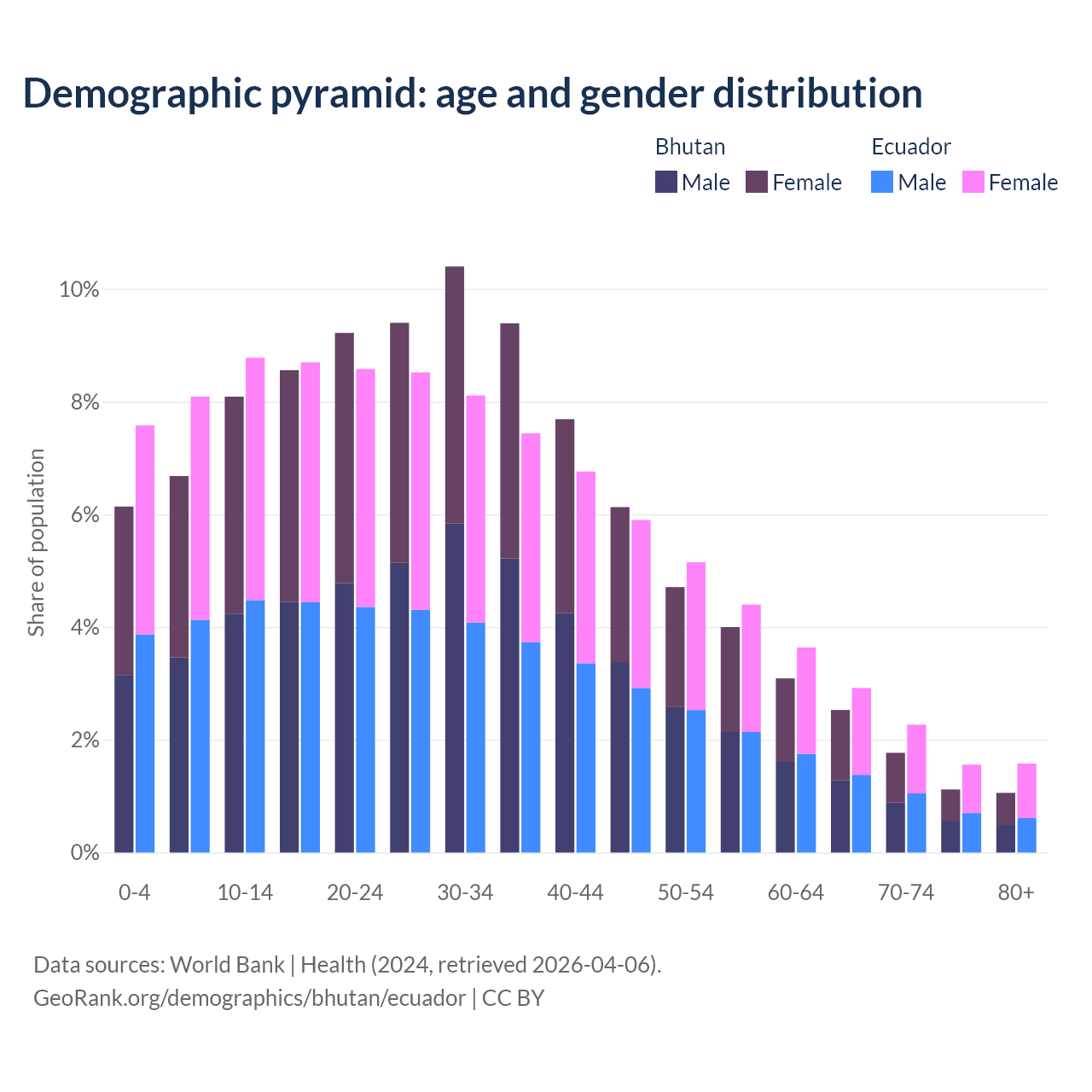 - Bhutan is ranked 95/196 by median age (oldest to youngest) vs 105/196 for Ecuador.