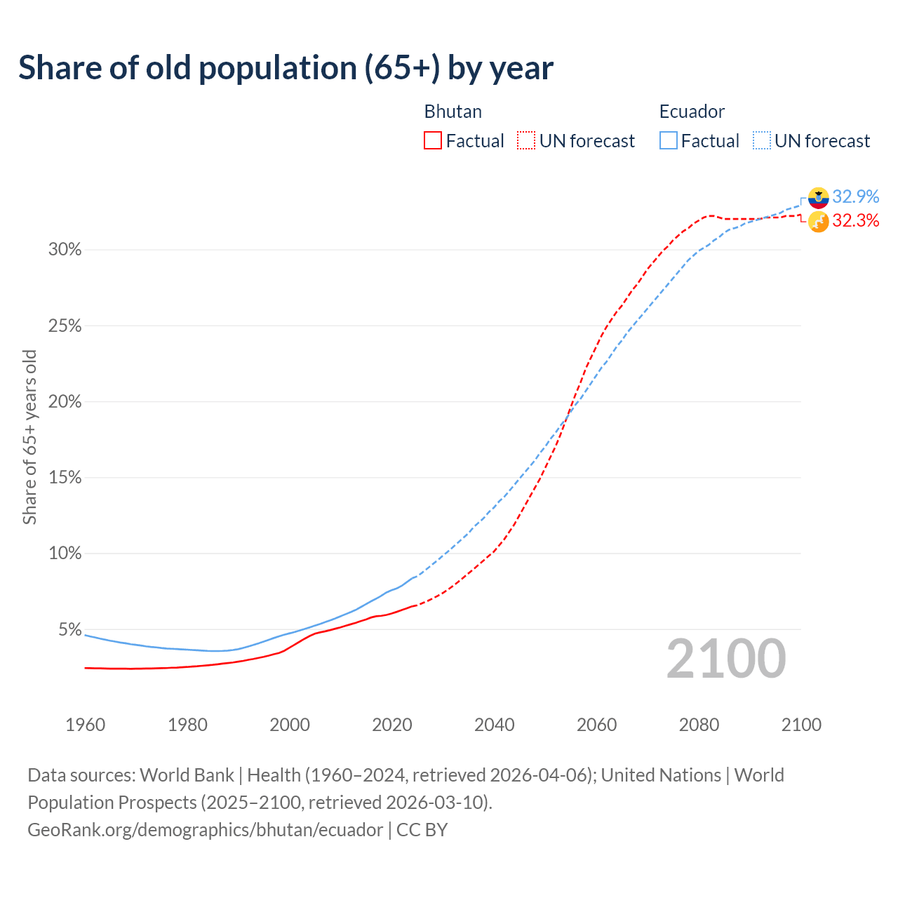 - The share of old-age demographic (65+) in Bhutan is 6.49% vs 8.34% in Ecuador.