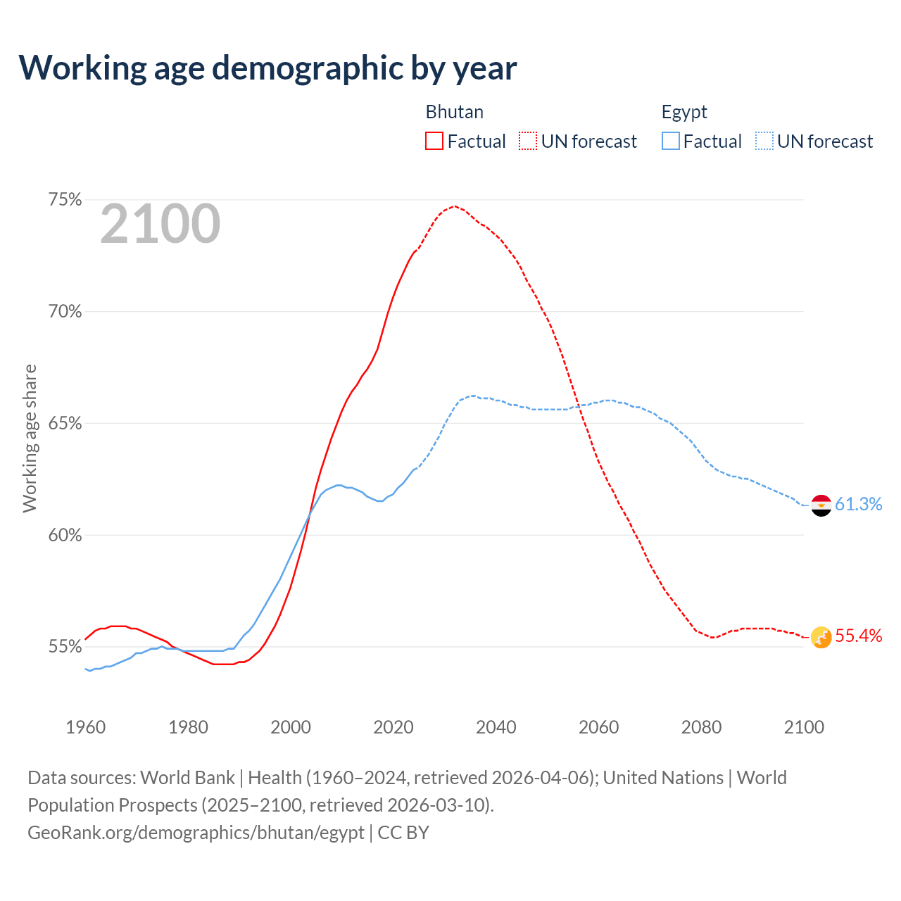 - Bhutan has 583K working age adults (aged 15-64) vs 75.9M in Egypt.