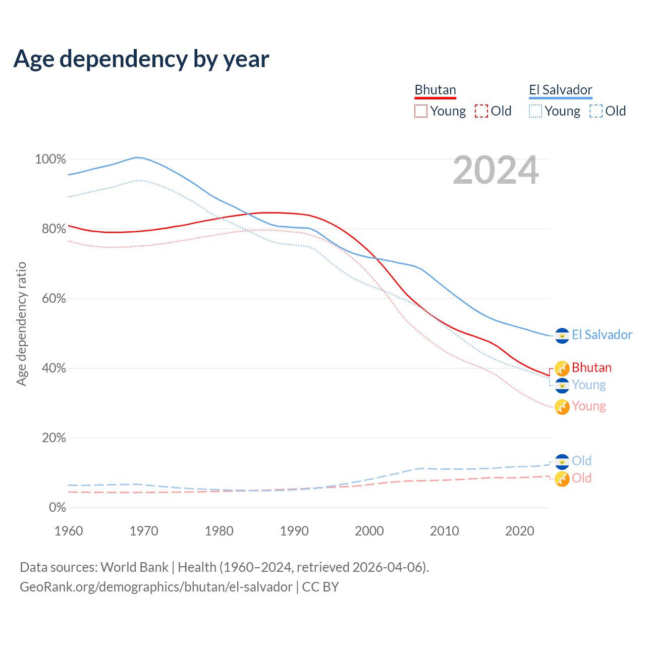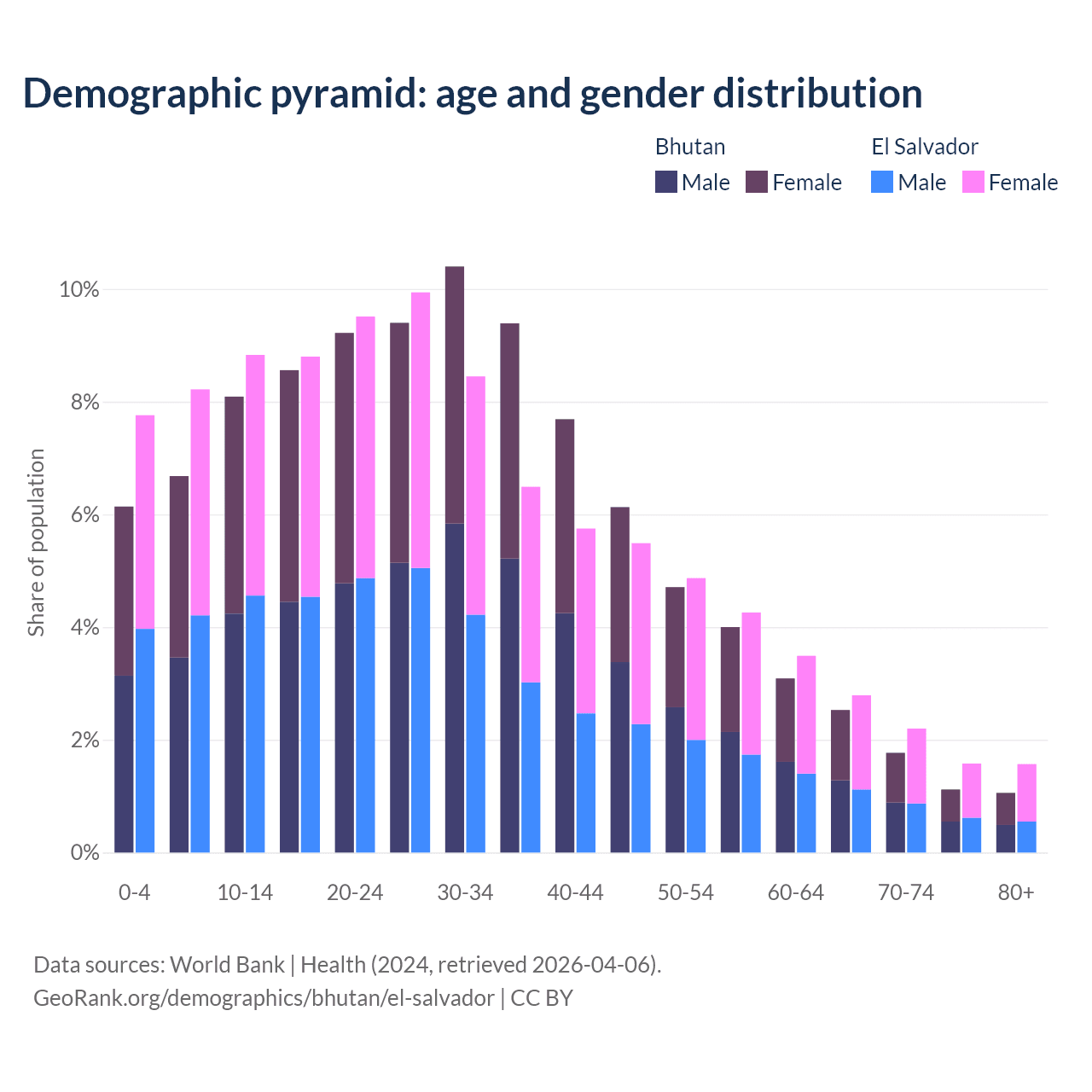 - Bhutan is ranked 95/196 by median age (oldest to youngest) vs 115/196 for El Salvador.