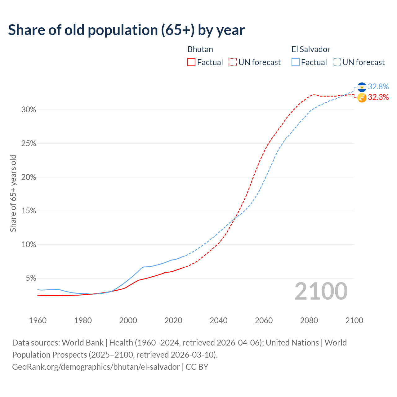 - The share of old-age demographic (65+) in Bhutan is 6.49% vs 8.15% in El Salvador.