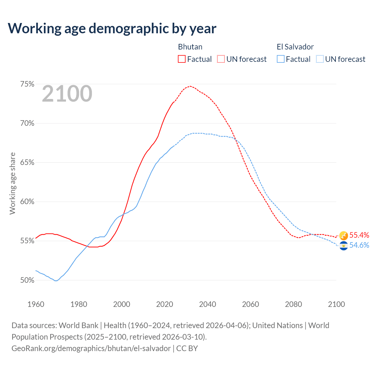 - Bhutan has 583K working age adults (aged 15-64) vs 4.29M in El Salvador.
