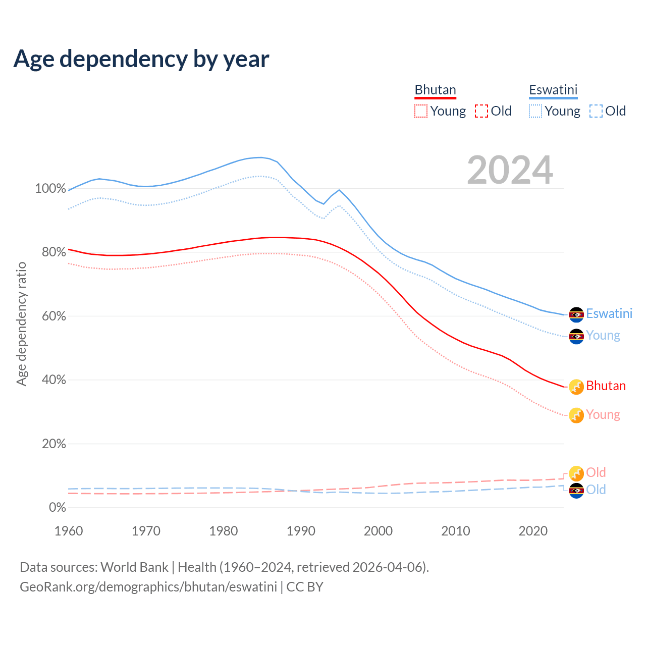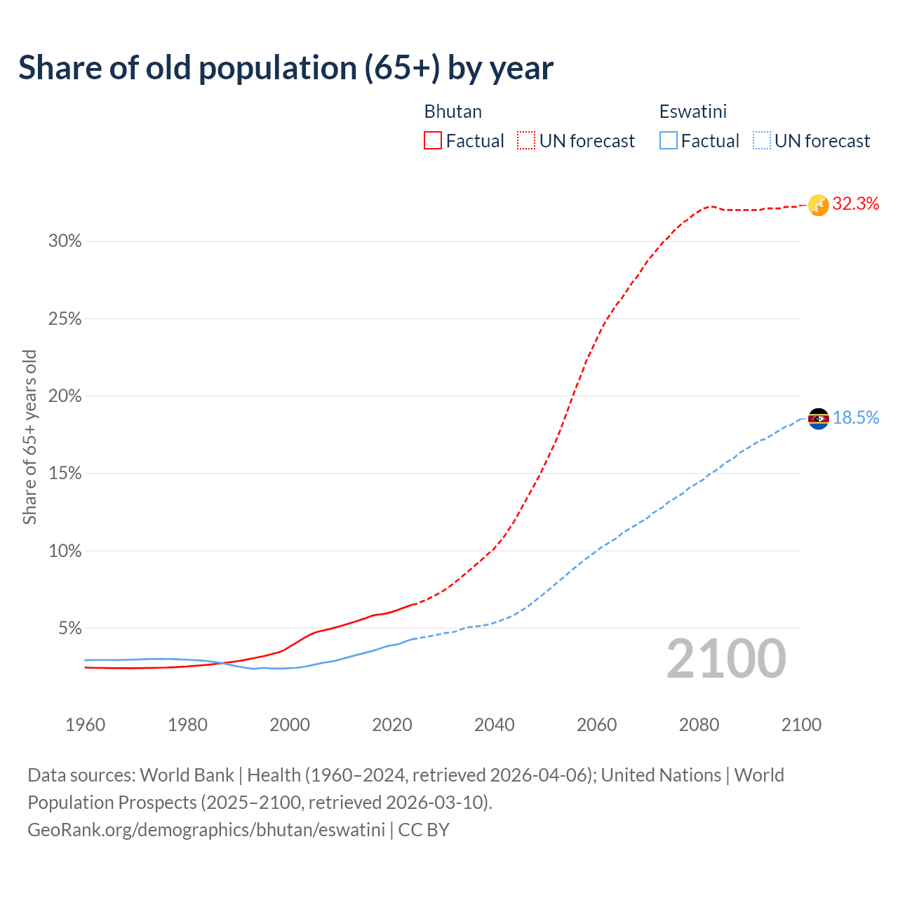 - The share of old-age demographic (65+) in Bhutan is 6.49% vs 4.26% in Eswatini.