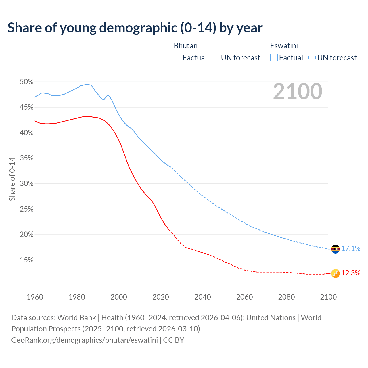 - The share of young demographic (0-15 years old) in Bhutan is 20.9% vs 33.4% in Eswatini.