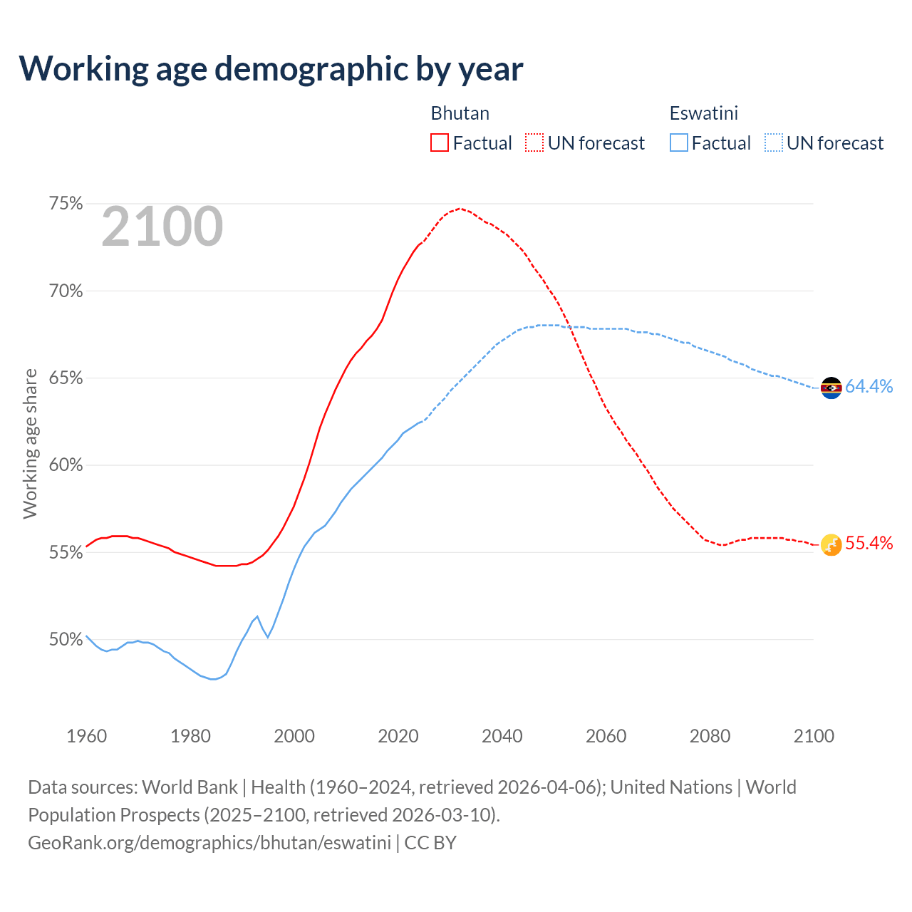 Median age Bhutan vs Eswatini, 1960-2100