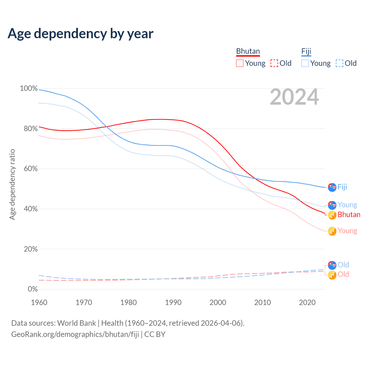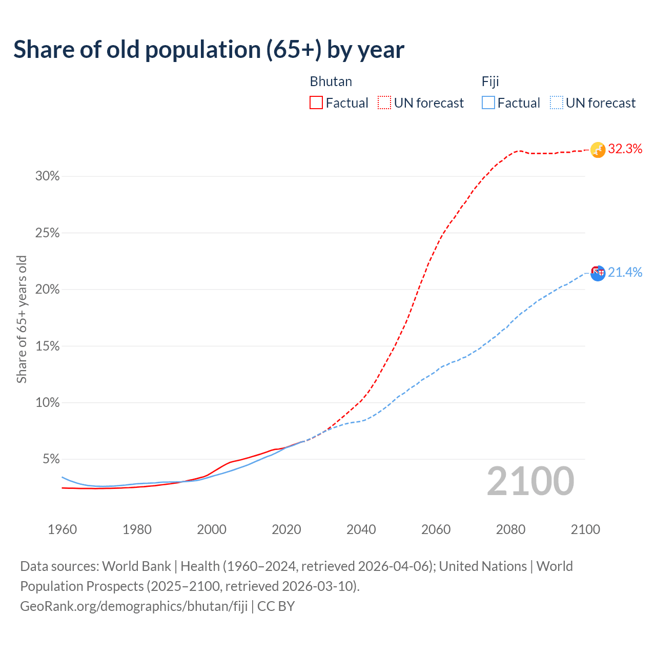 - The share of old-age demographic (65+) in Bhutan is 6.49% vs 6.49% in Fiji.