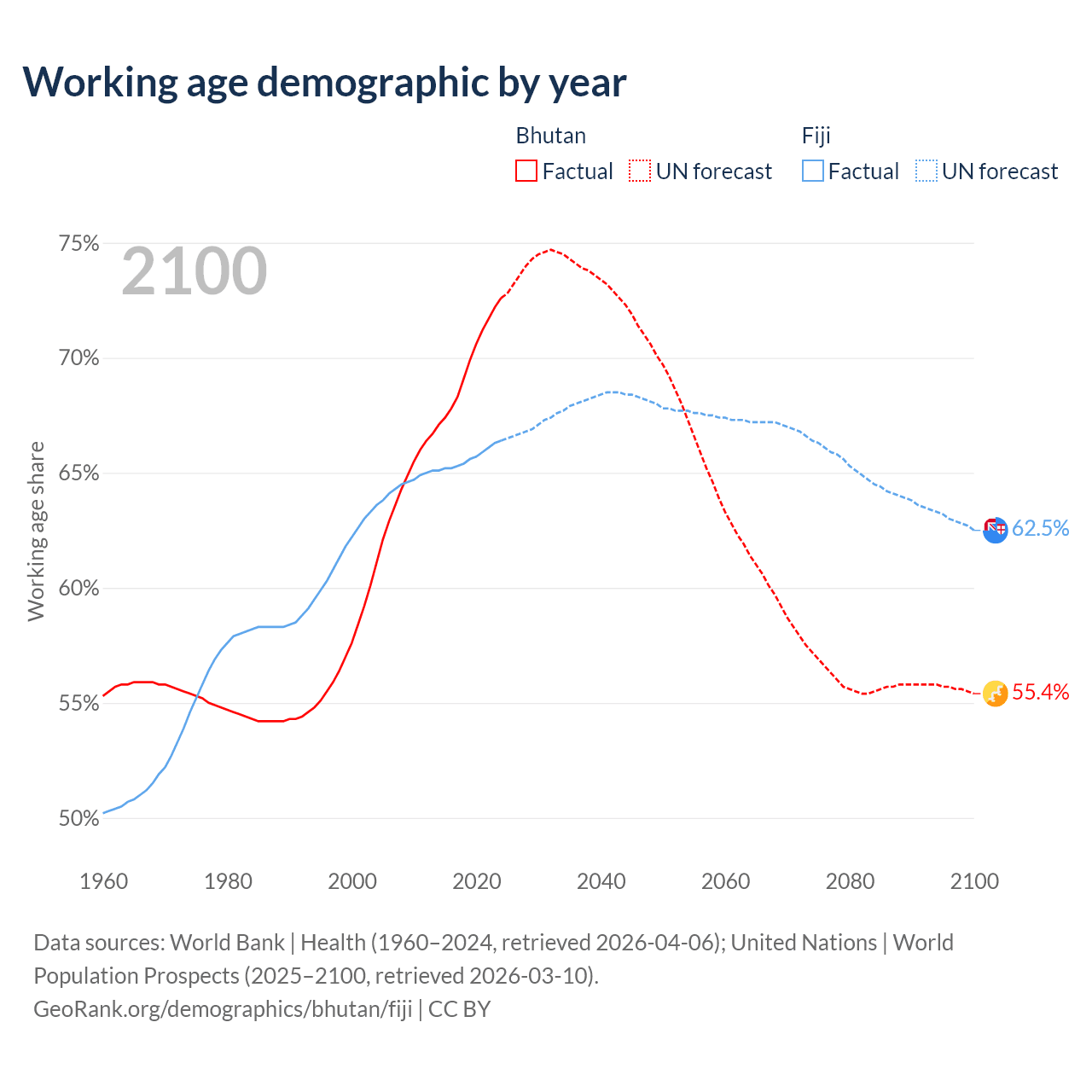 Median age Bhutan vs Fiji, 1960-2100