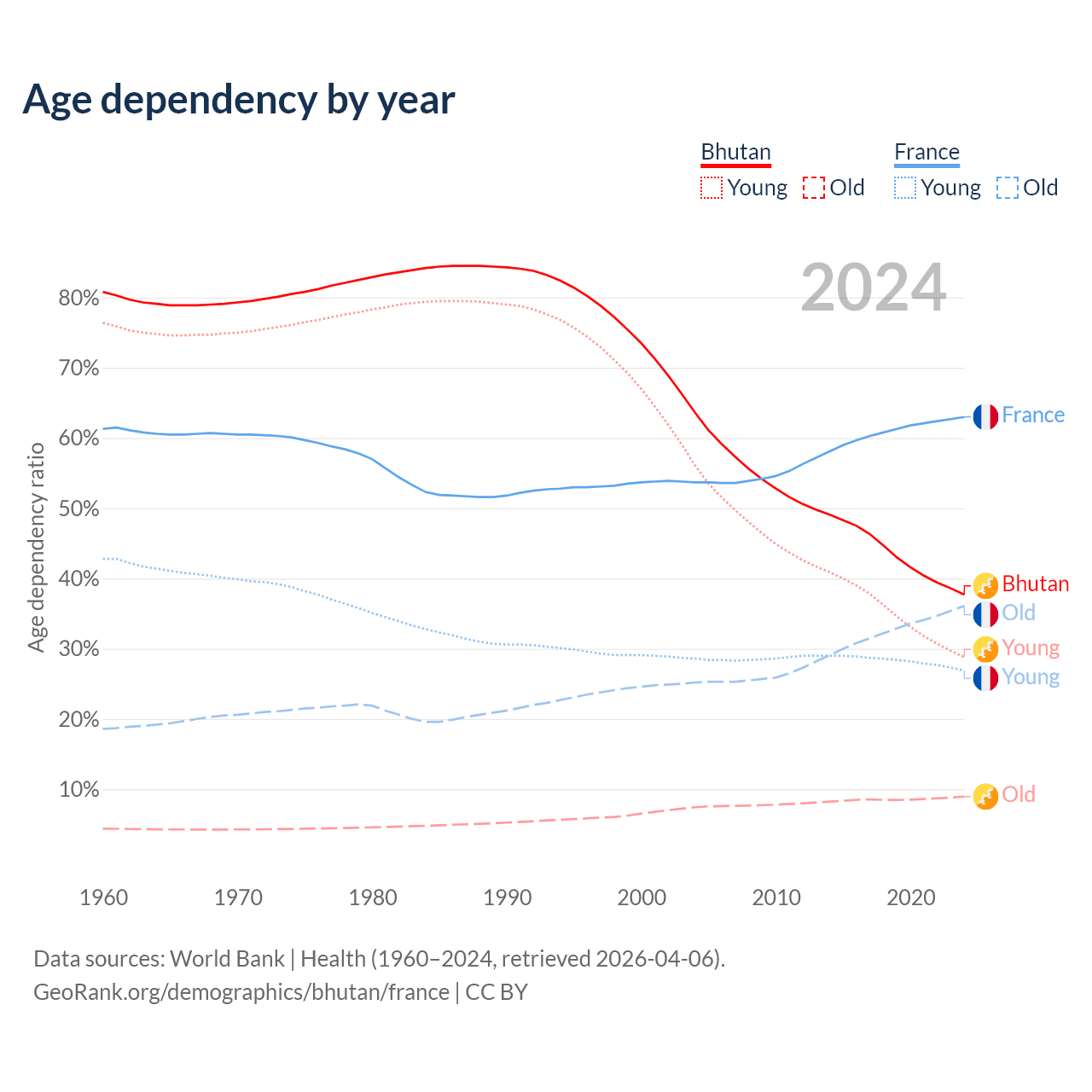 - The share of old-age demographic (65+) in Bhutan is 6.49% vs 22.1% in France.
