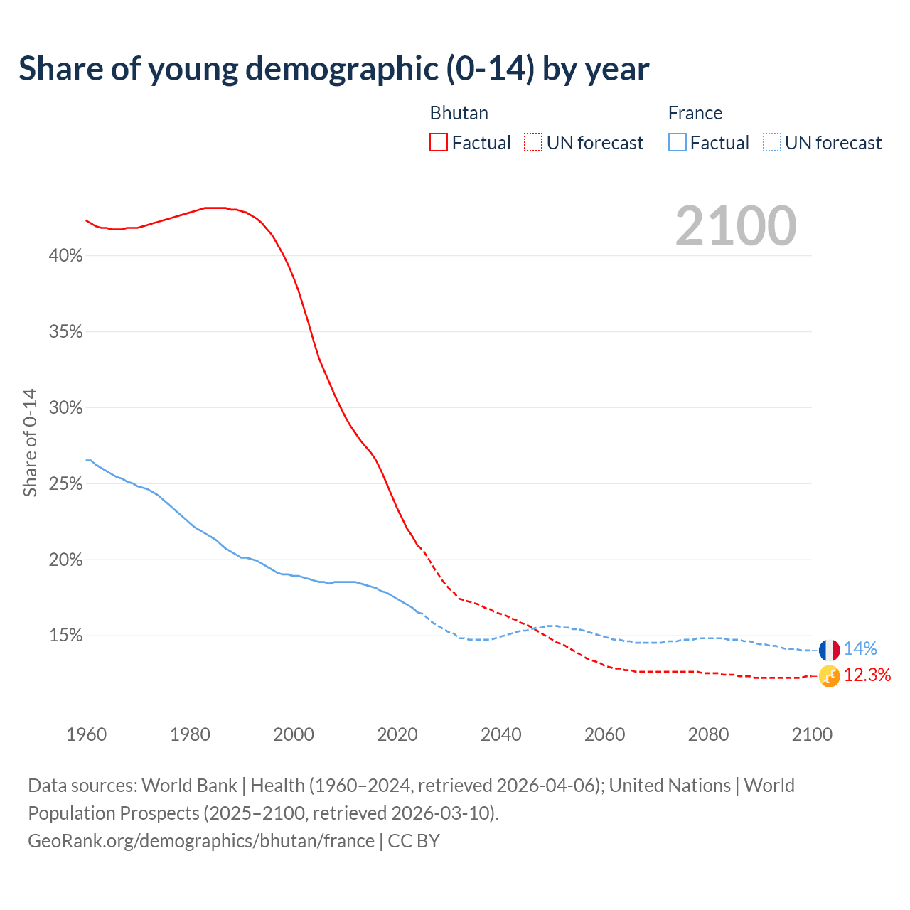 - The share of young demographic (0-15 years old) in Bhutan is 20.9% vs 16.5% in France.