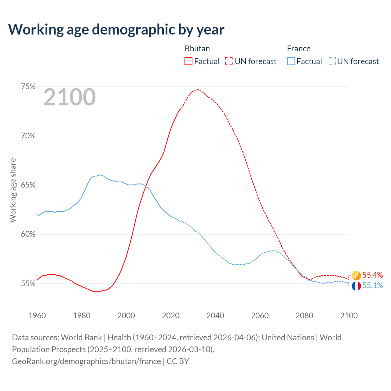 Median age Bhutan vs France, 1960-2100