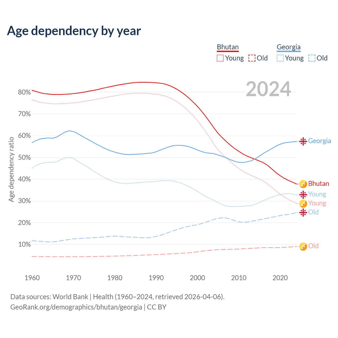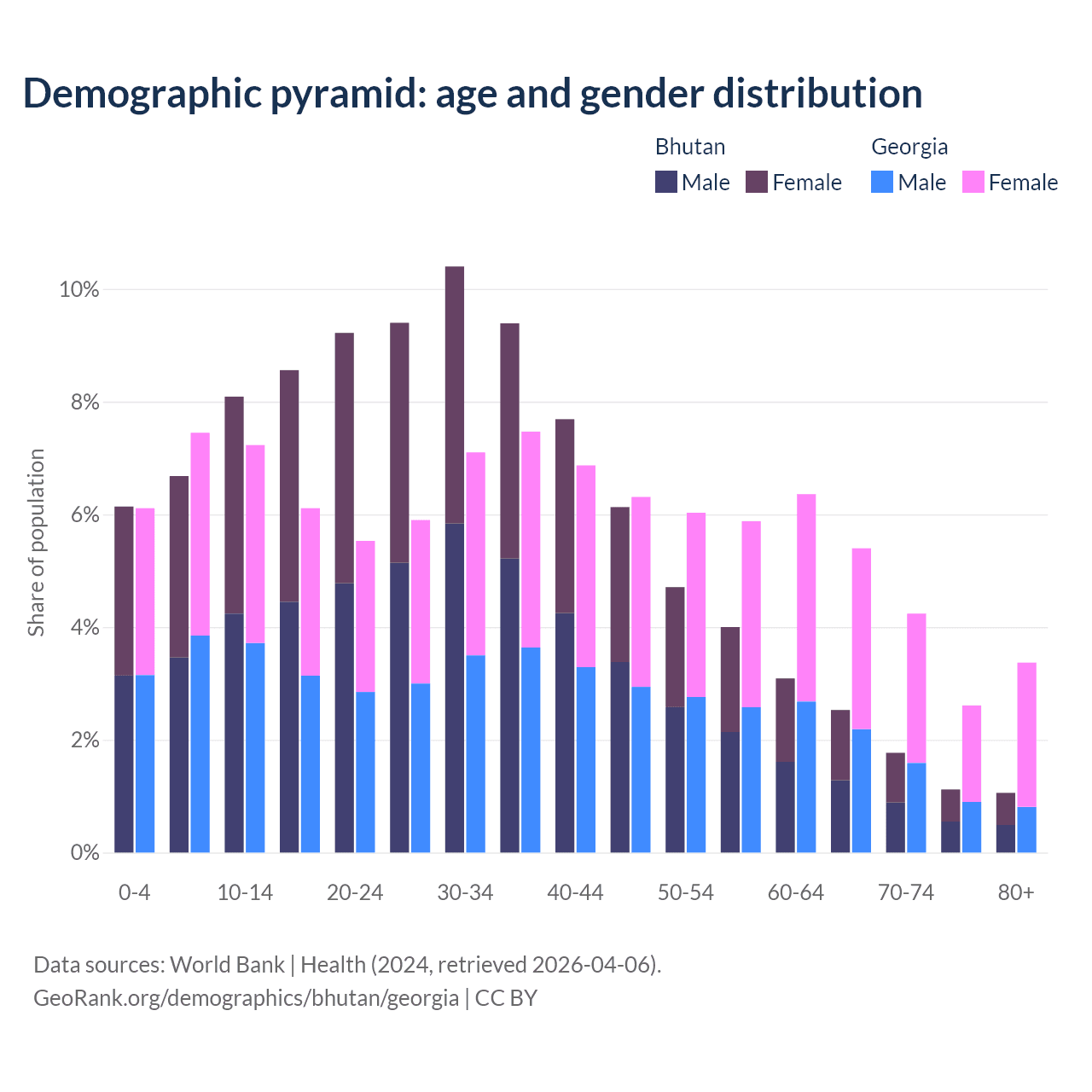 - Bhutan is ranked 95/196 by median age (oldest to youngest) vs 59/196 for Georgia.