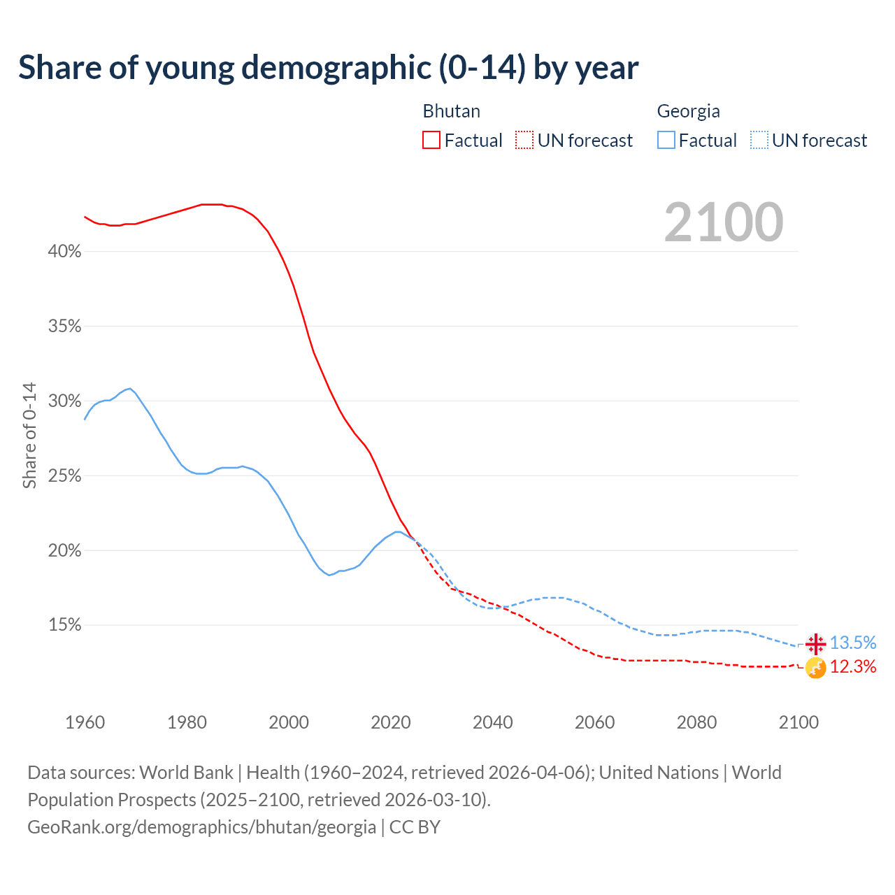 - The share of young demographic (0-15 years old) in Bhutan is 20.9% vs 20.8% in Georgia.